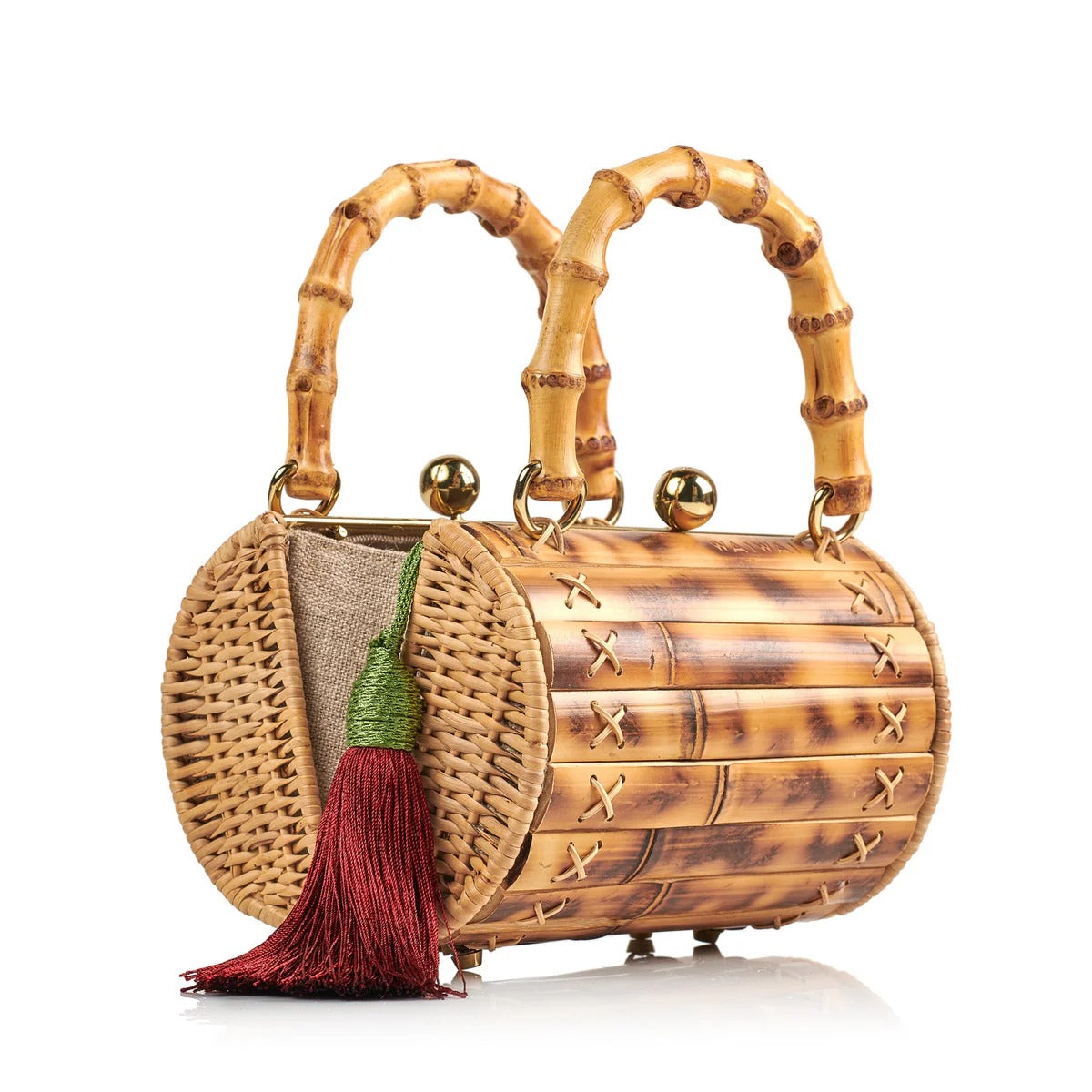 Handwoven rattan and bamboo bag. Bamboo handle and removable leather shoulder strap. Comes with a silk pendant. Can be used as a shoulder bag, crossbody or handbag.