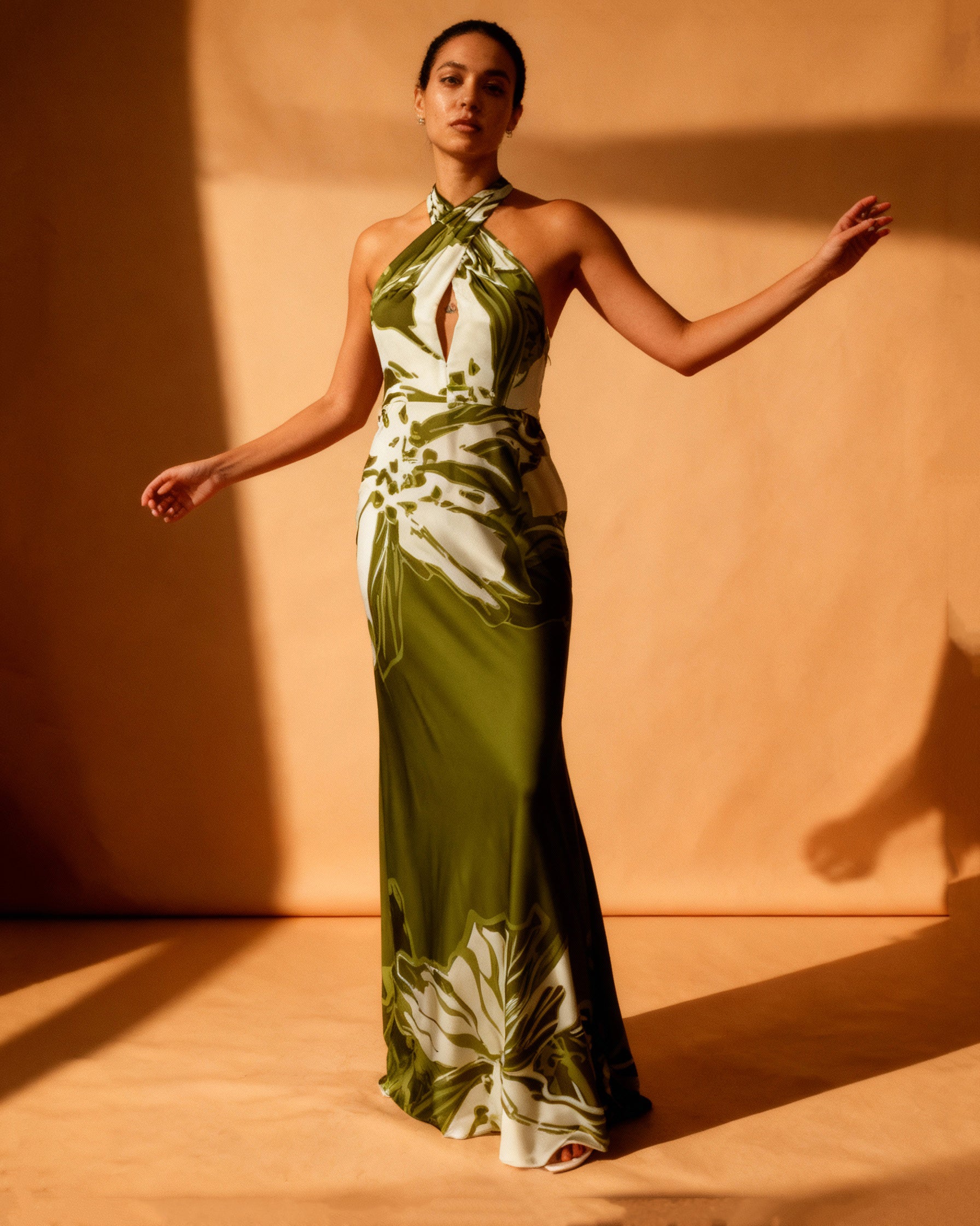 The Rococo Sand Avo Maxi Dress combines elegance with contemporary design through its distinctive halter neck and cross-back construction, offering both support and a flattering silhouette. Delicate floral prints frame the neckline and hem, creating visual interest while maintaining sophisticated simplicity. This maxi length piece transitions seamlessly from daytime gatherings to evening occasions, making it a versatile addition to any wardrobe. The thoughtful design details ensure comfort without compromising on style.