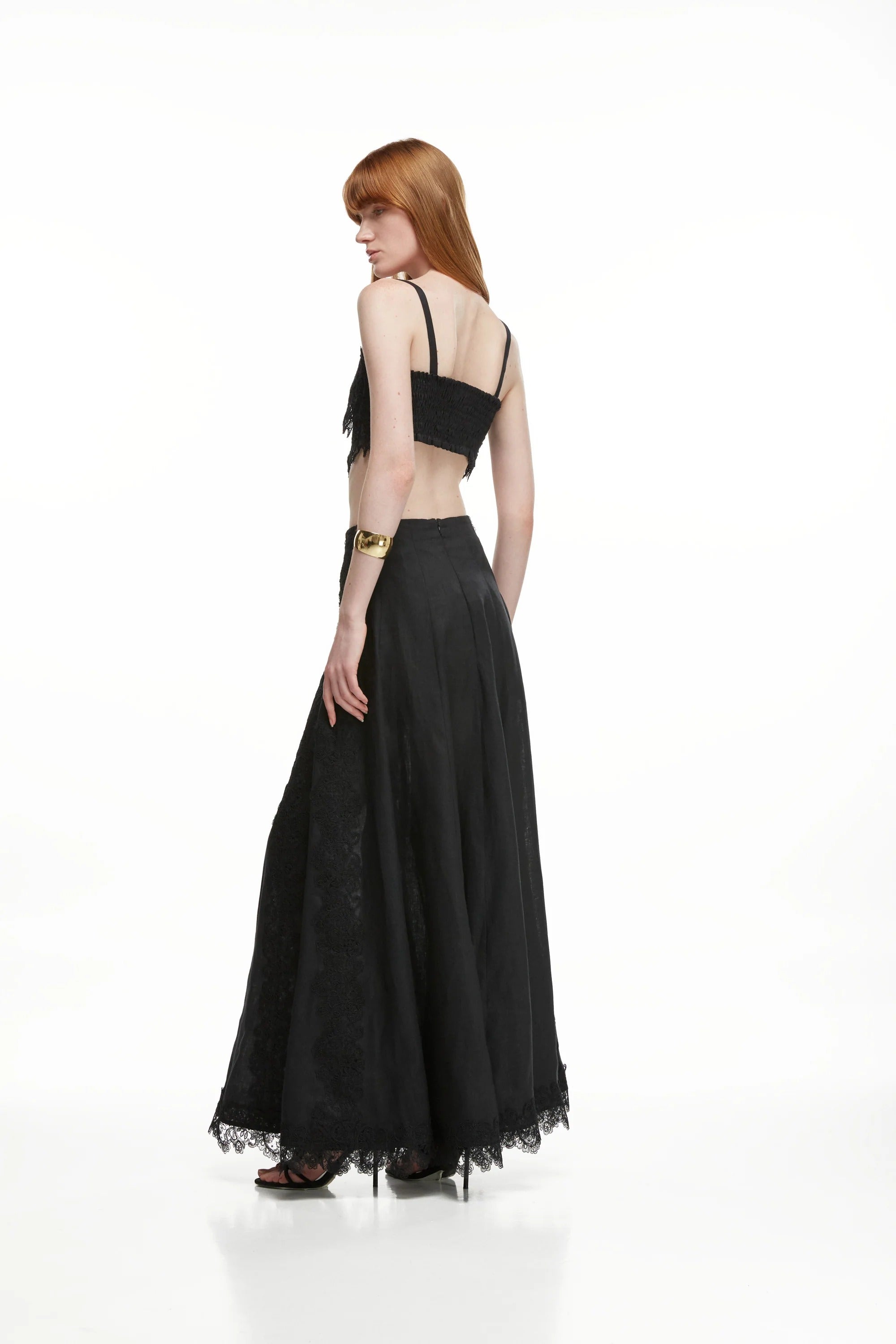The Resplandor Maxi Skirt, crafted from 100% linen, radiates a magnetic elegance that fuses the lightness of summer with the sophistication of the night. Its long, flowing silhouette moves with an ethereal grace, while delicate lace panels run along the skirt, adding texture and an artisanal touch that enhances its romantic character. Ideal for sunset events or seaside dinners, this skirt pairs perfectly with the Amanecer Top or delicate blouses, wrapping every step in an aura of mystery and distinction.
