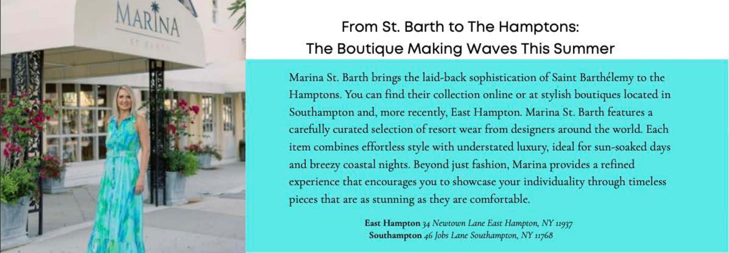 Marina St. Barth infuses the Hamptons with the relaxedelegance of Saint Barthélemy. Nestled in both Southampton and East Hampton, the boutique offers thoughtfully curated resort wear from global designers. Each piece blends effortless style with quiet luxury, perfect for sun-drenched days and coastal evenings. More than fashion, Marina offers a refined escape at her Hamptons and Florida boutiques, inviting you to express your individuality with timeless pieces that feel as beautiful as they look. marina-stbarth.com