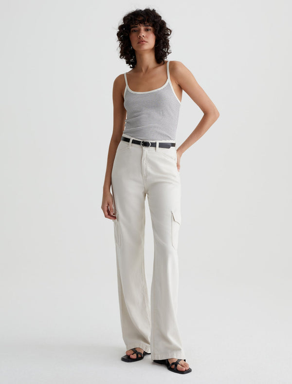 The Gatina wide-leg cargo pants in off-white are a utilitarian-inspired style made from 9.25 oz. Hazy Silk Denim, a soft and luxurious blend of silk, modal, and cotton. This pair features a high-rise waist and long, loose-fitting legs with flap pockets at the sides. Angled hip pockets at the front and squared-off patch pockets at the back.