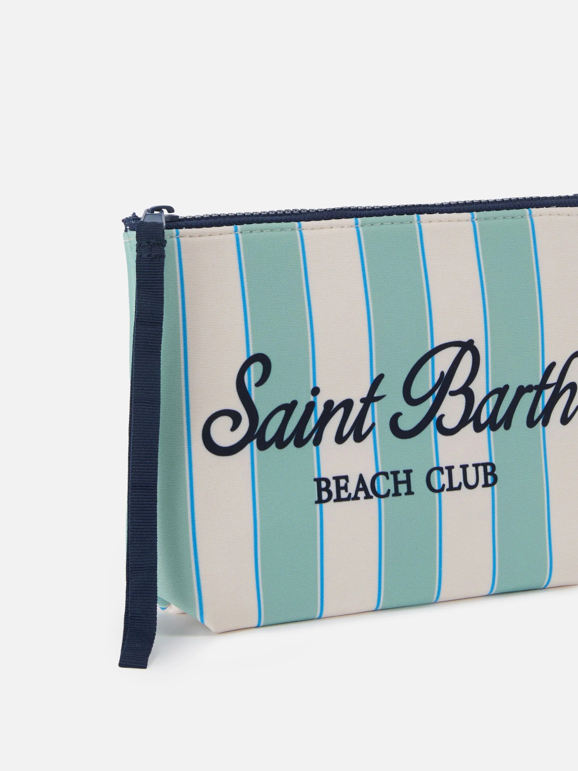 The Aline pouch is practical and versatile with a contemporary design. Crafted from scuba textile, it features a striped pattern with a contrasting Beach Club logo on the front for a fresh and distinctive touch. Complete with a zip closure and grosgrain side strap, it is perfect for organizing your essentials in style, easy to match and practical to use on any occasion.
