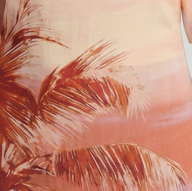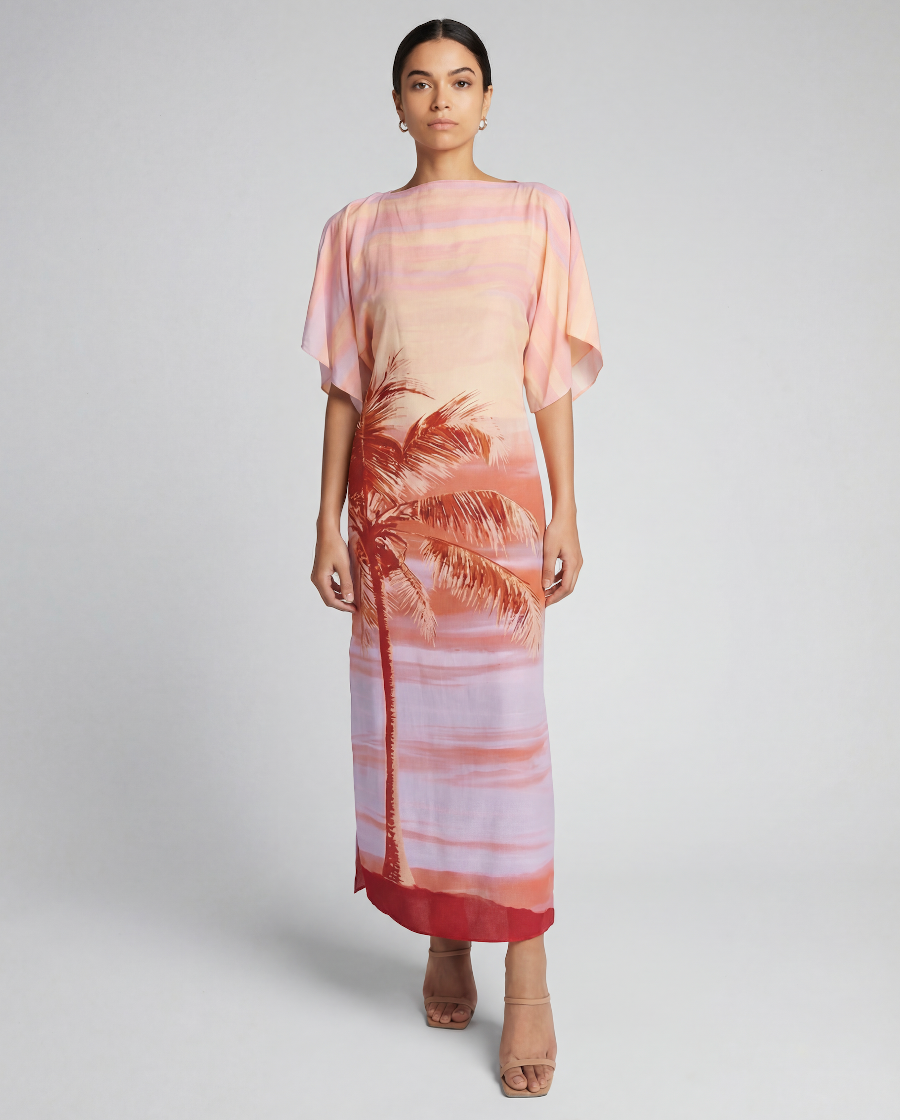 This long dress features a relaxed silhouette with soft short sleeves and a clean, straight neckline for effortless elegance. Designed in a lightweight, fluid fabric, it is accented with a bold palm print and finished with an ankle-length hem—ideal for refined resort wear and summer evenings.