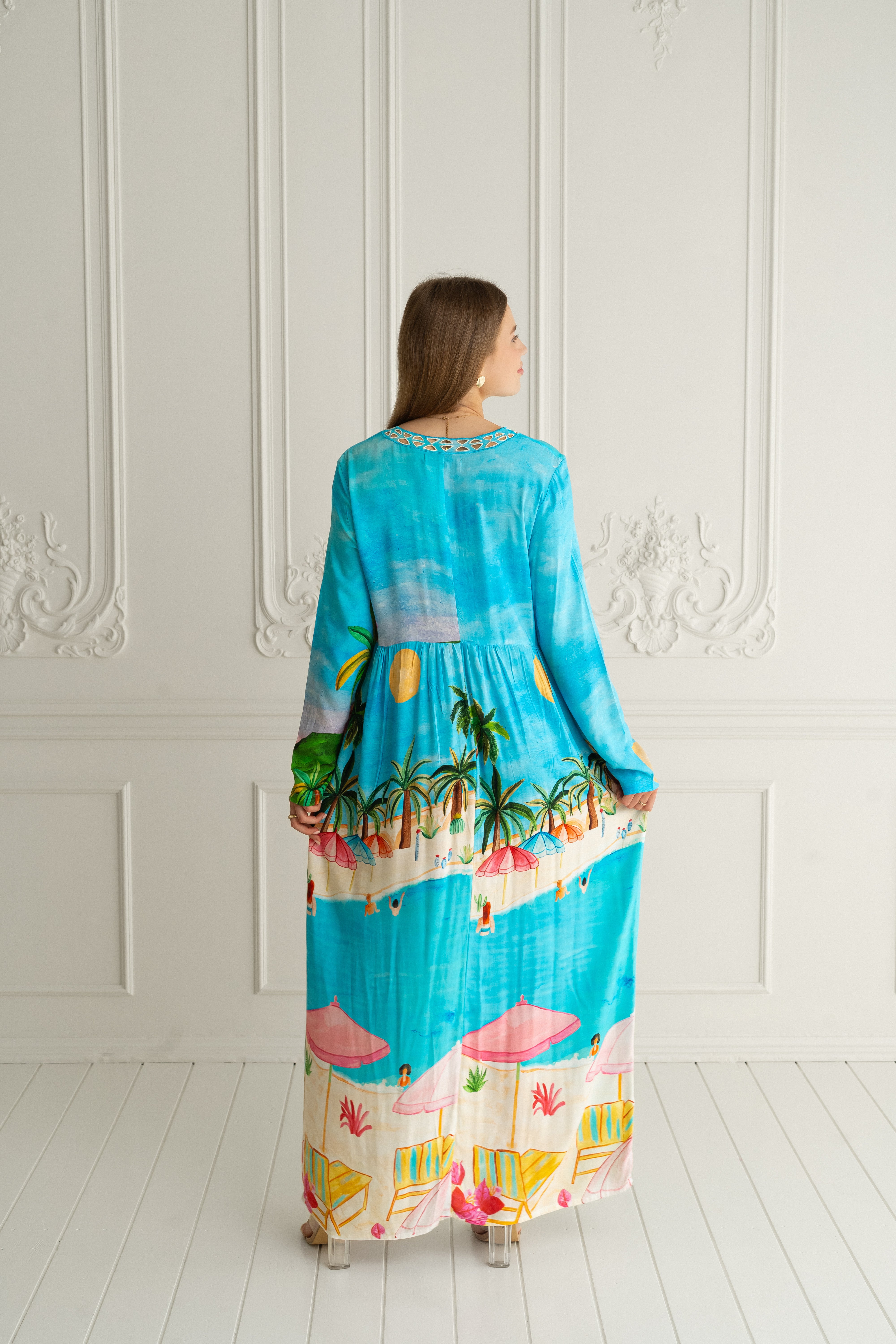 Bella Riviera Maxi Dress Effortless sophistication meets timeless elegance in this flowing maxi dress. Designed with graceful long sleeves and a sweeping silhouette, it transitions seamlessly from evening affairs to refined daytime occasions. The luxurious fabric drapes beautifully, creating an understated yet striking presence. Perfect for those who appreciate understated luxury and enduring style.
