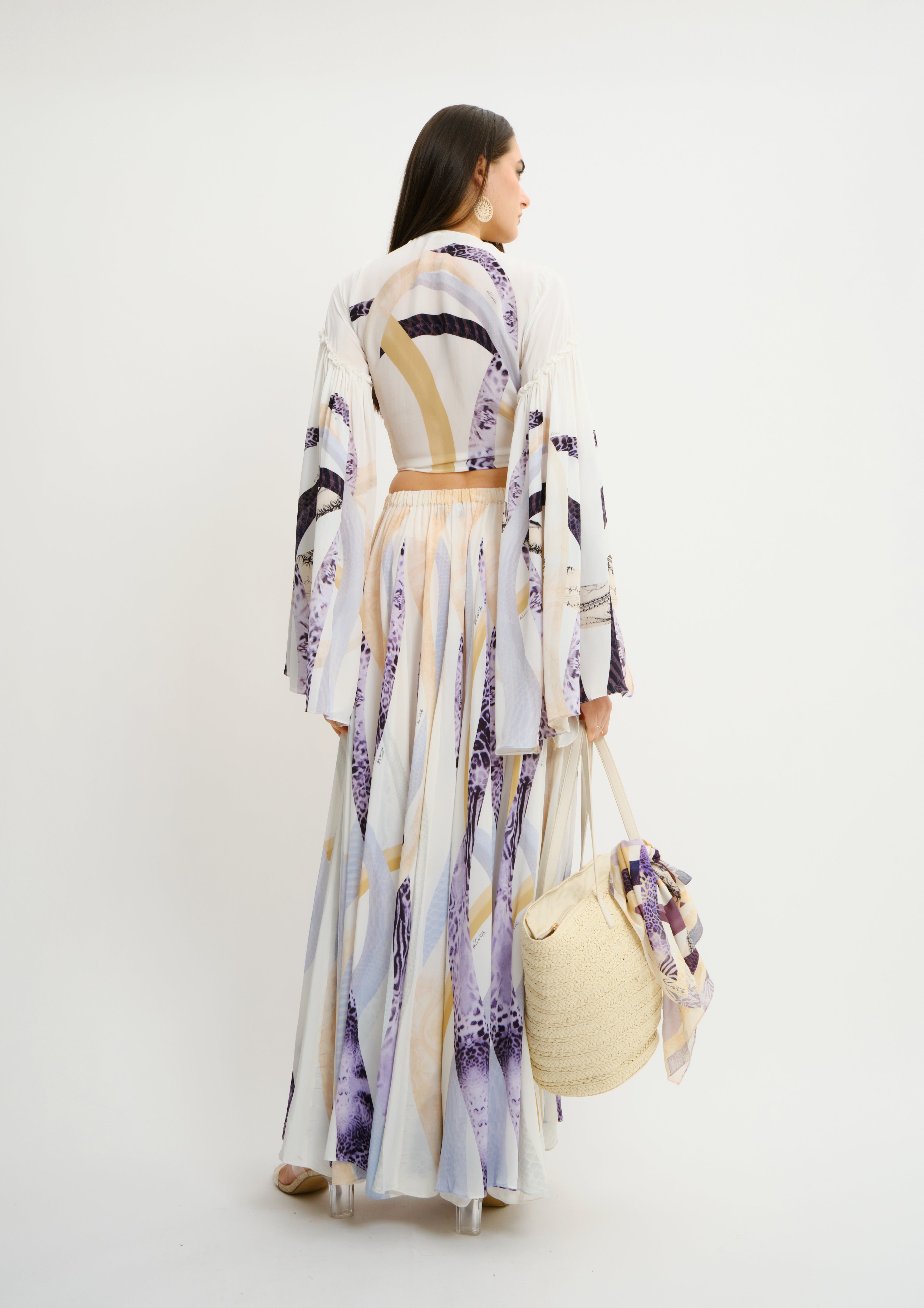 Flowing long sleeves and a relaxed silhouette define this bohemian top, designed for effortless elegance. The deep V-neckline ties at the center, creating a flattering focal point while the generous cut allows for comfortable movement. Perfect for layering or wearing solo, this piece transitions seamlessly from day to evening, offering a refined take on relaxed luxury.