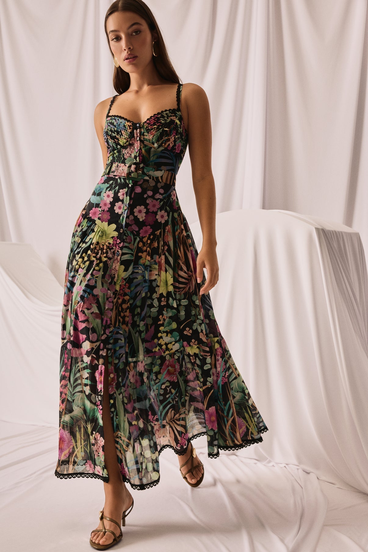 The Cael dress is an elongated midi that marries corset structure with airy movement. Crafted in botanical-print cotton voile, it features a fitted, corset-style bodice edged in scalloped lace. Delicate lace-trim straps and a front button placket underscore its feminine, artisanal character.
