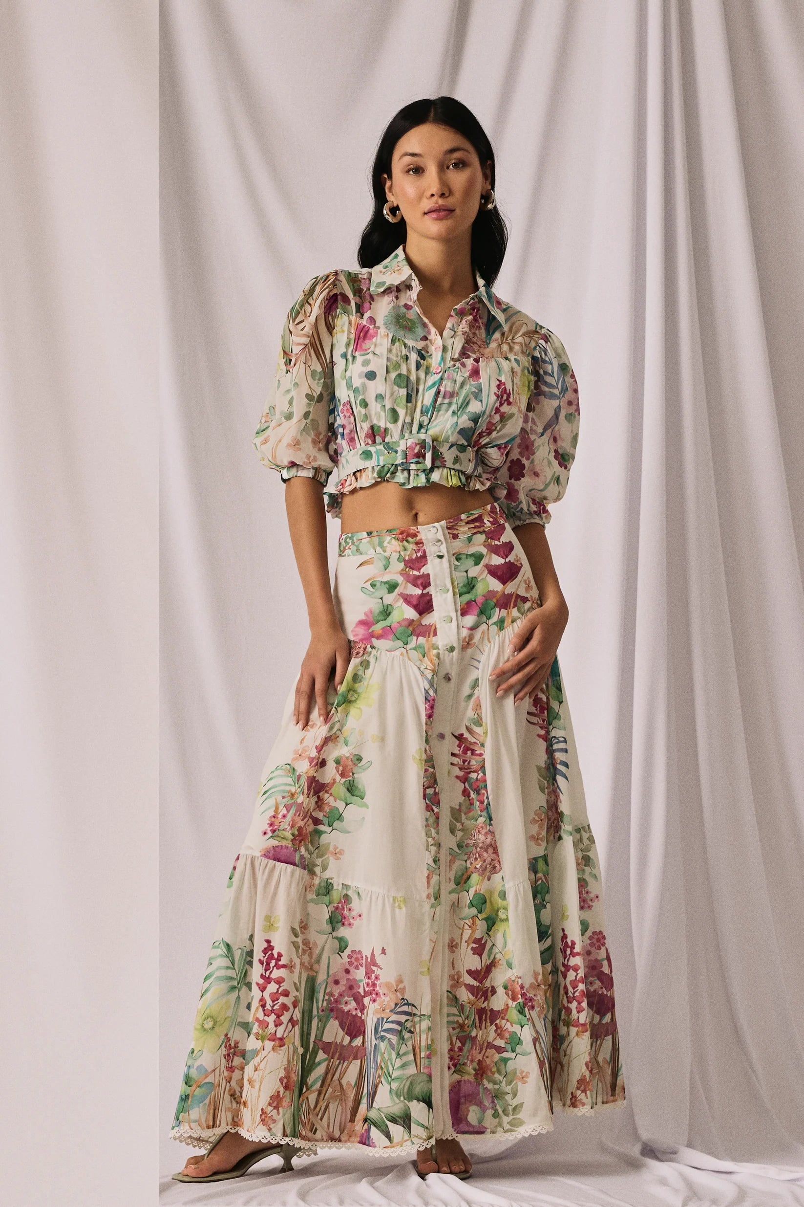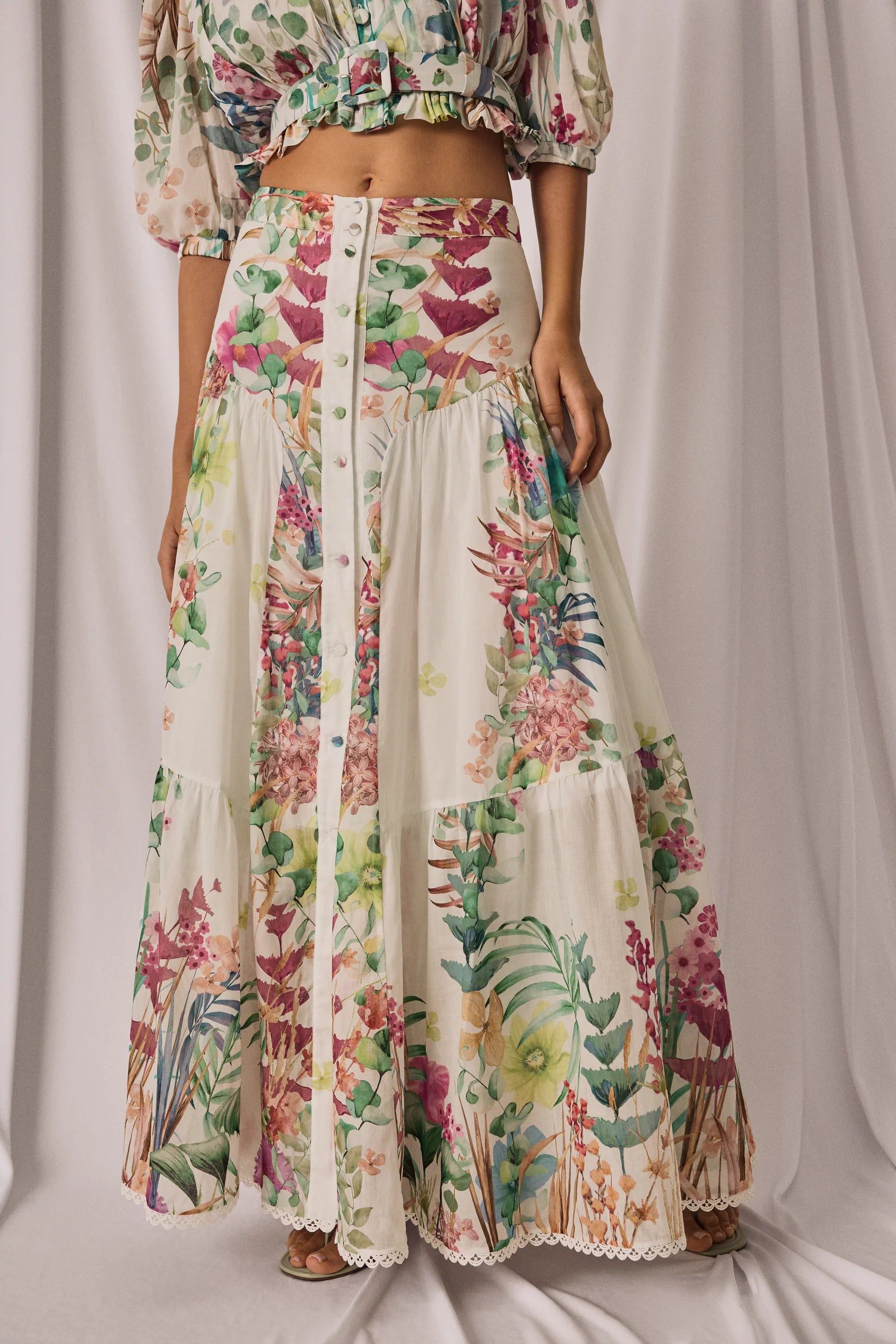 Immerse yourself in the luxury and sophistication of the ROSELLE skirt—a long, airy style in cotton voile. A high waist with shaped yoke gently frames the hips, opening to a button-front slit that elongates the silhouette. Generous panelsfall into fluid movement and finish in a lace-trim hem for an artisanal, feminine touch. Pair with bustier tops, breezy shirts or simple tanks to elevate your summer wardrobe.