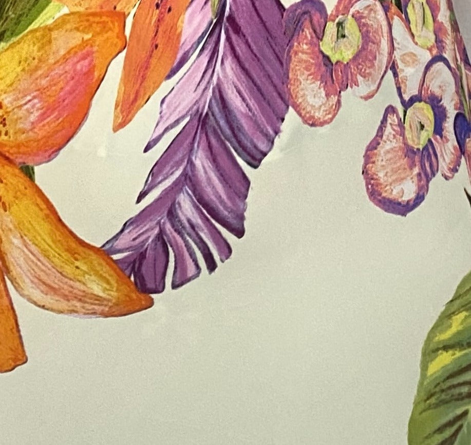 A feminine mini dress in soft natural crepe, featuring a romantic floral print in vibrant tropical tones. Designed with a flattering wrap-style neckline, long billowy sleeves, and a detachable belt to define the waist. Light, elegant, and easy to wear from day to evening.