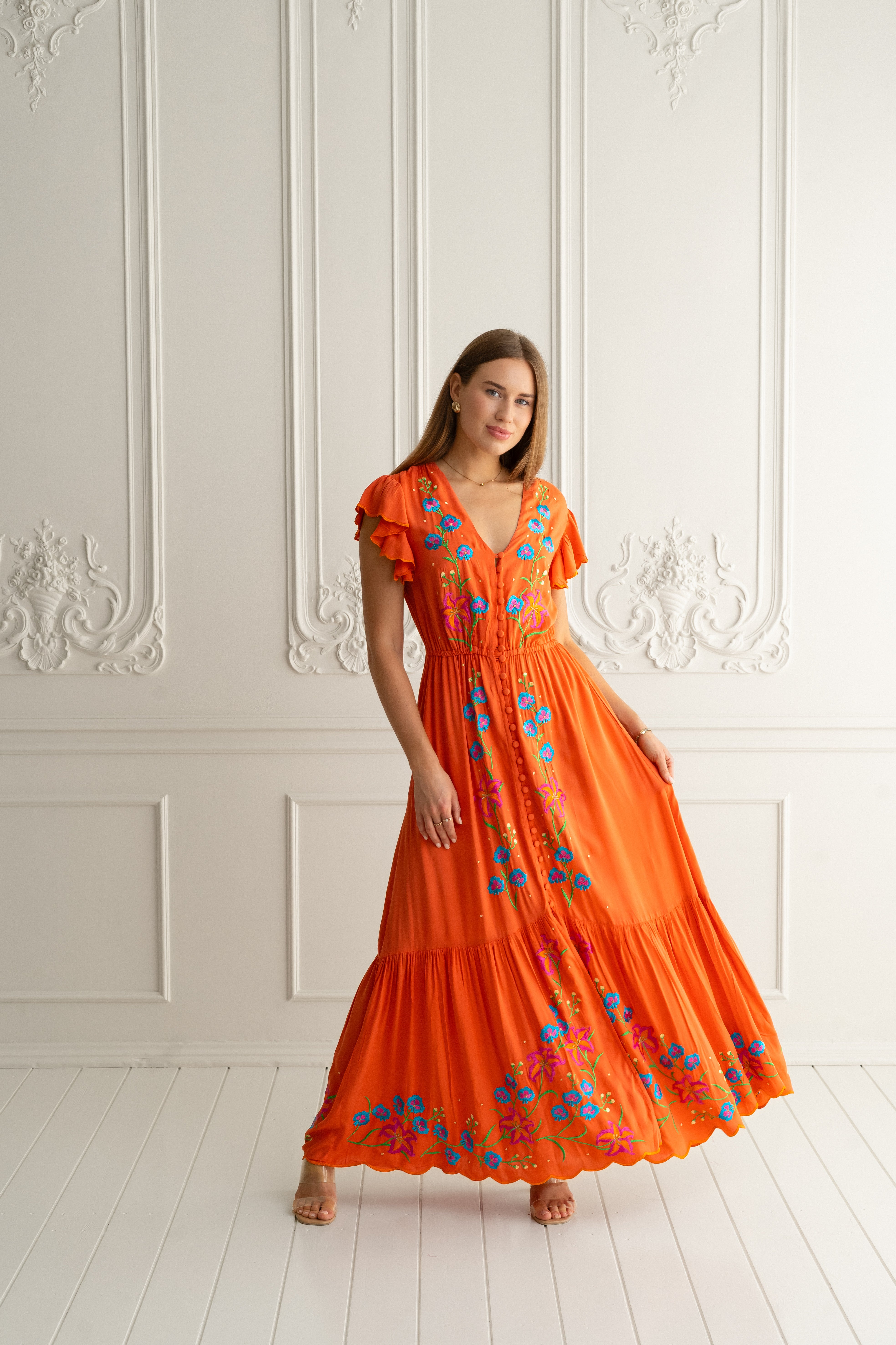 Floriana Maxi Dress features a graceful silhouette with a flattering V-neckline and fitted sleeves that frame the shoulders beautifully. The elasticized waist creates definition while allowing comfortable movement, making it an effortless choice for evening occasions or refined daytime wear. Crafted for timeless elegance, this maxi dress transitions seamlessly from season to season.