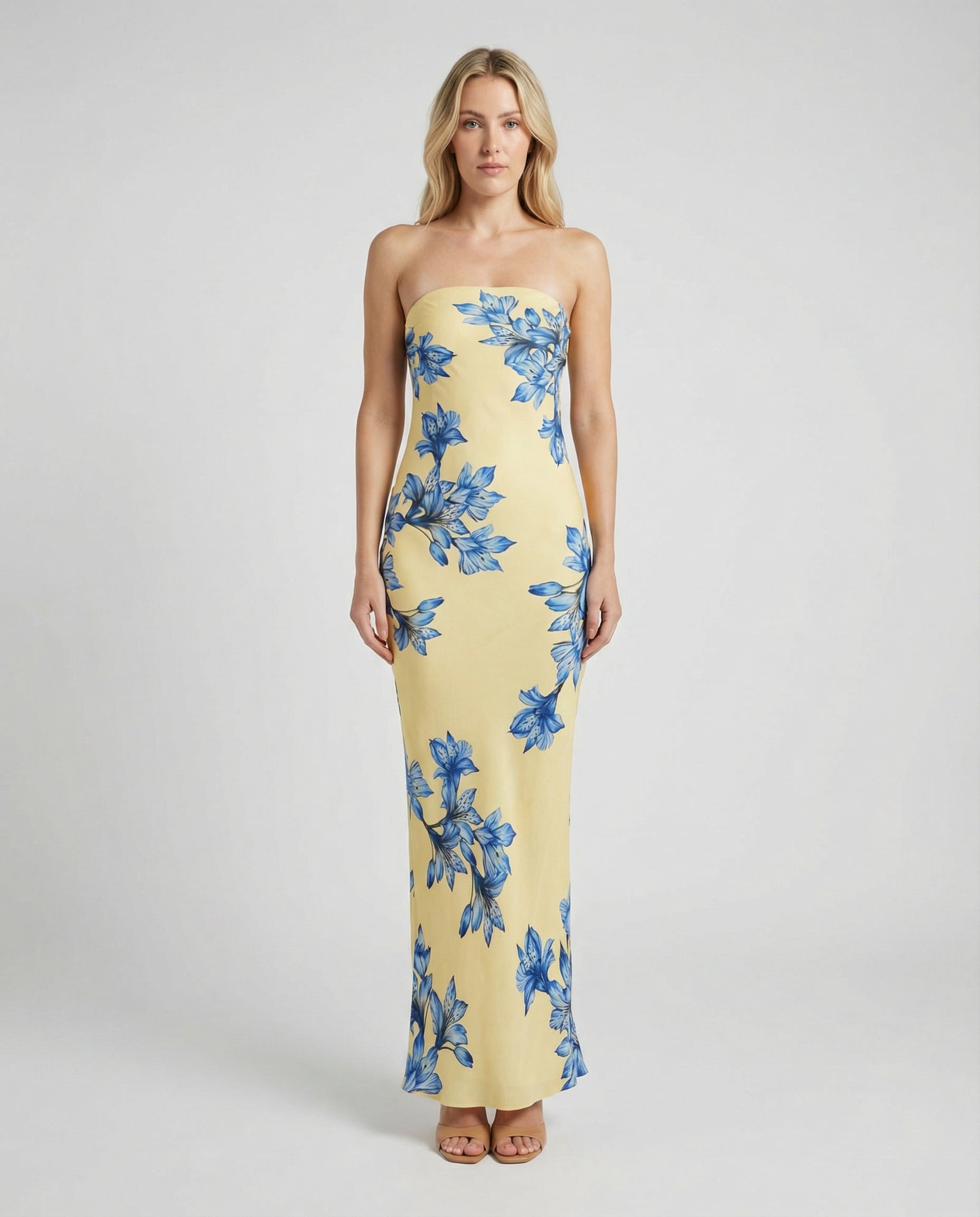Striking and feminine, this strapless maxi dress is crafted from smooth viscose satin with a luxurious, fluid drape. Set on a soft yellow base, it features bold blue floral prints that create a vibrant, sunlit look. The fitted silhouette enhances the figure, while the clean strapless neckline adds a modern, elegant touch.