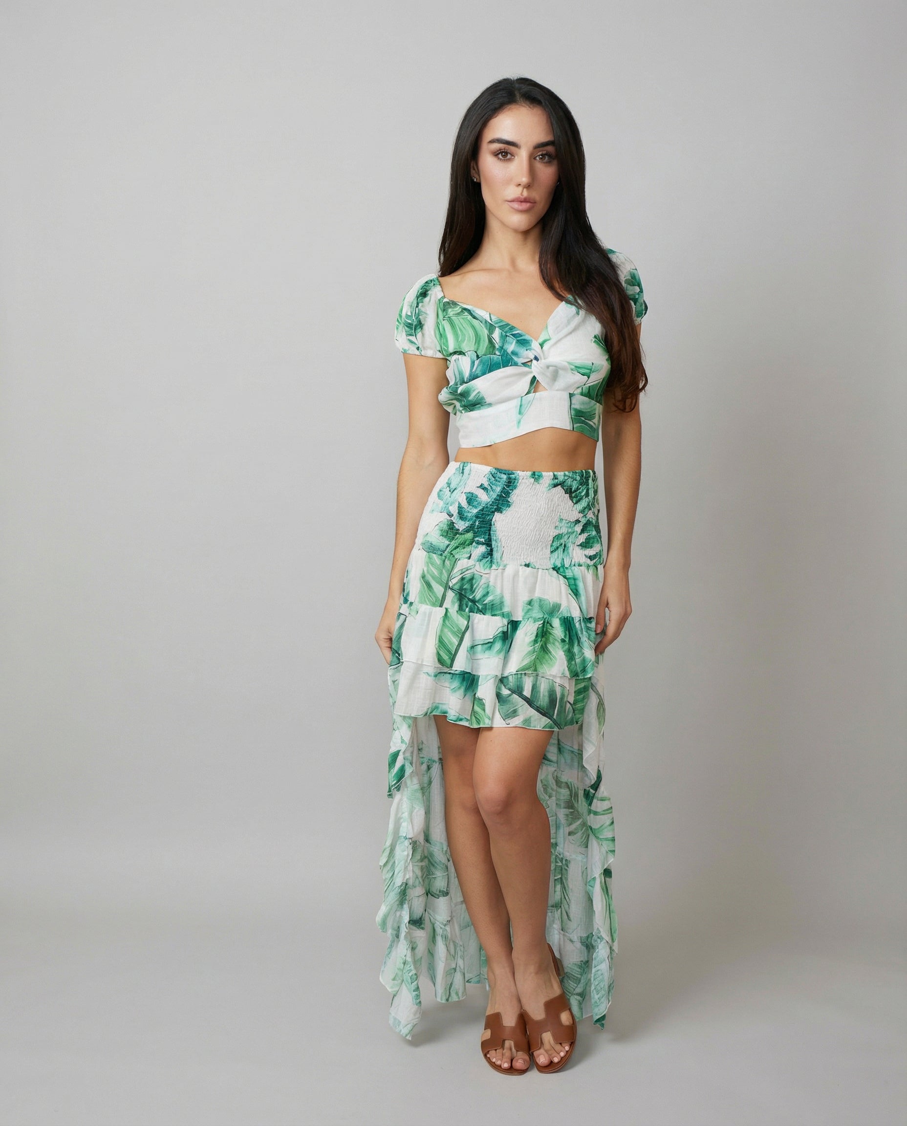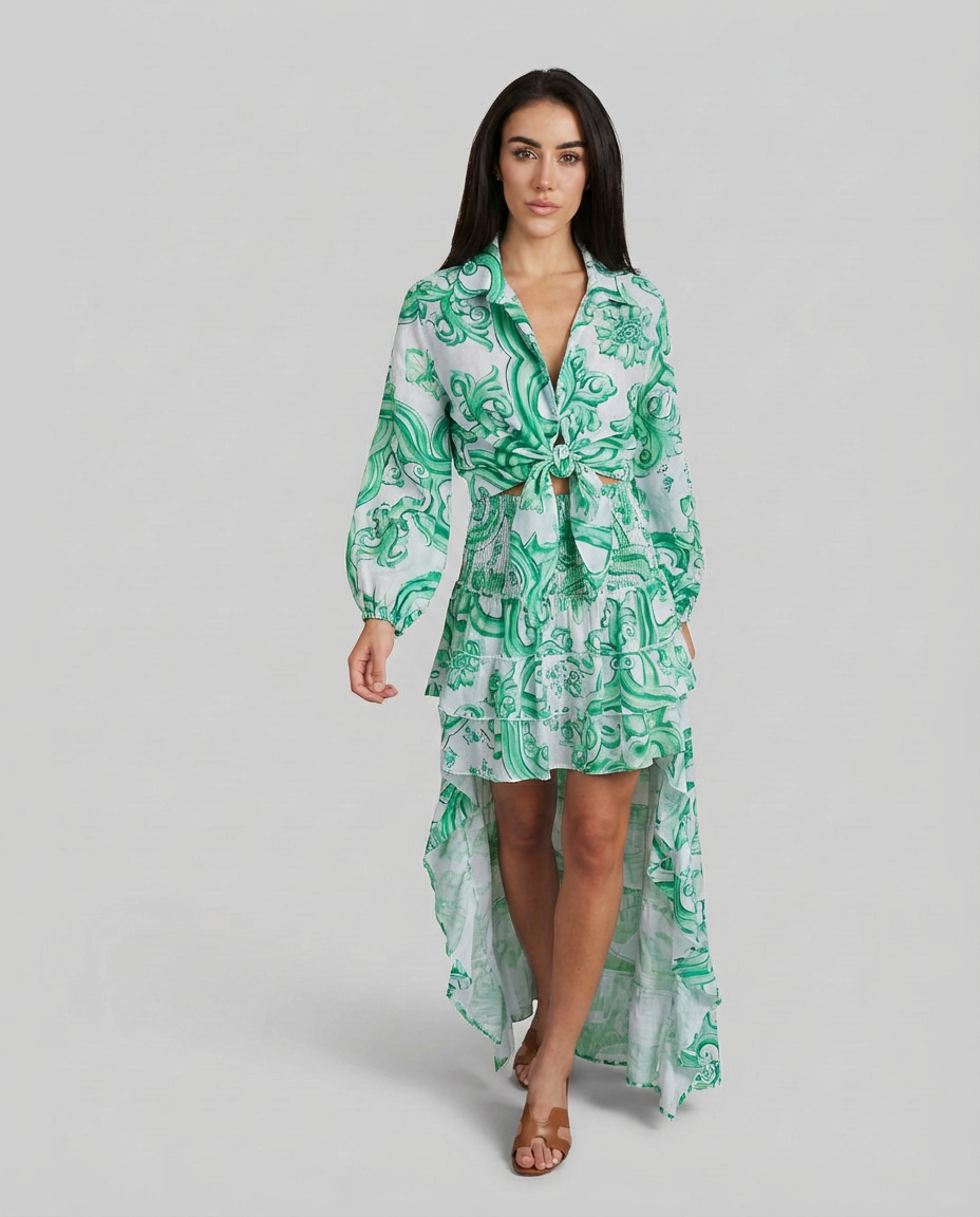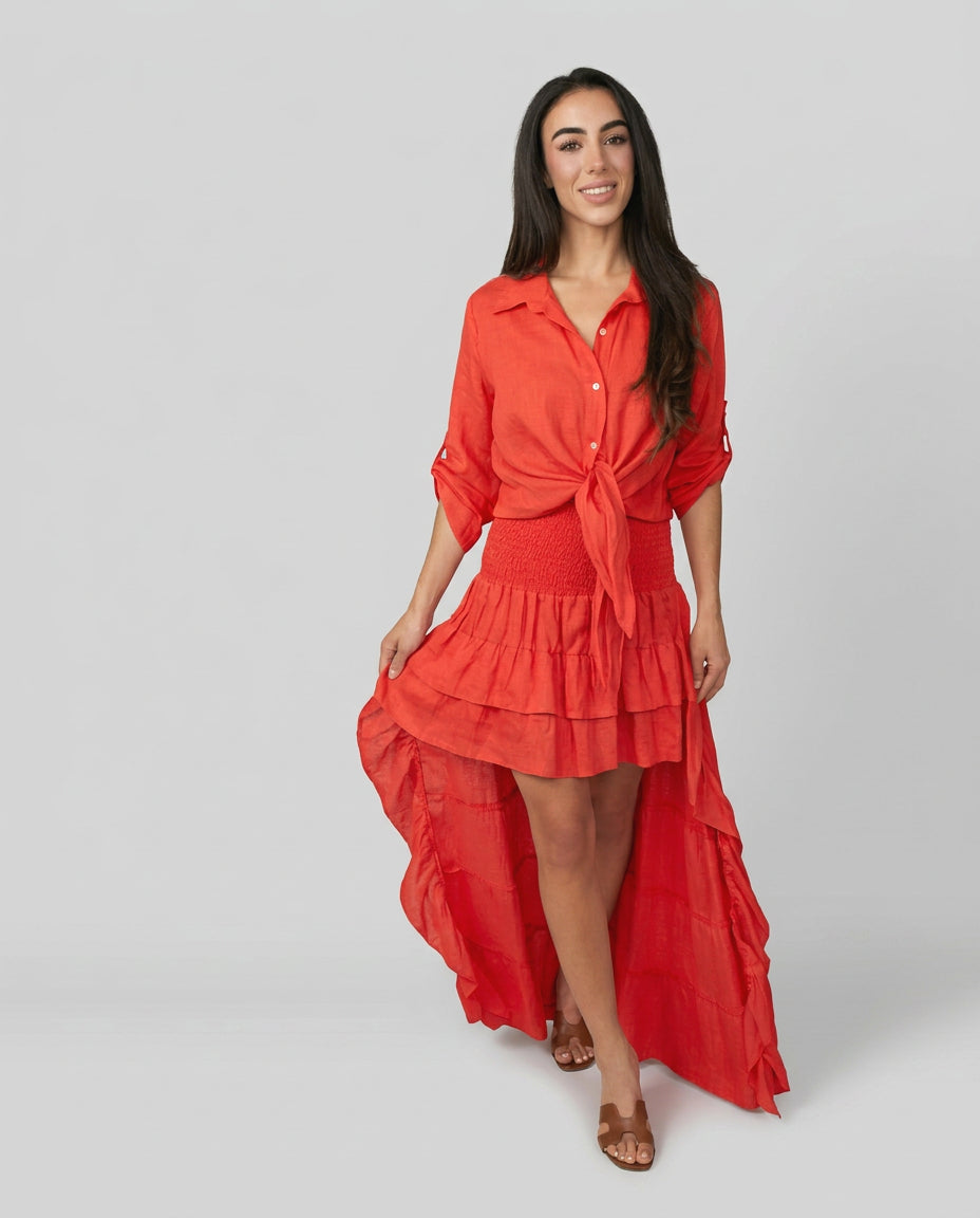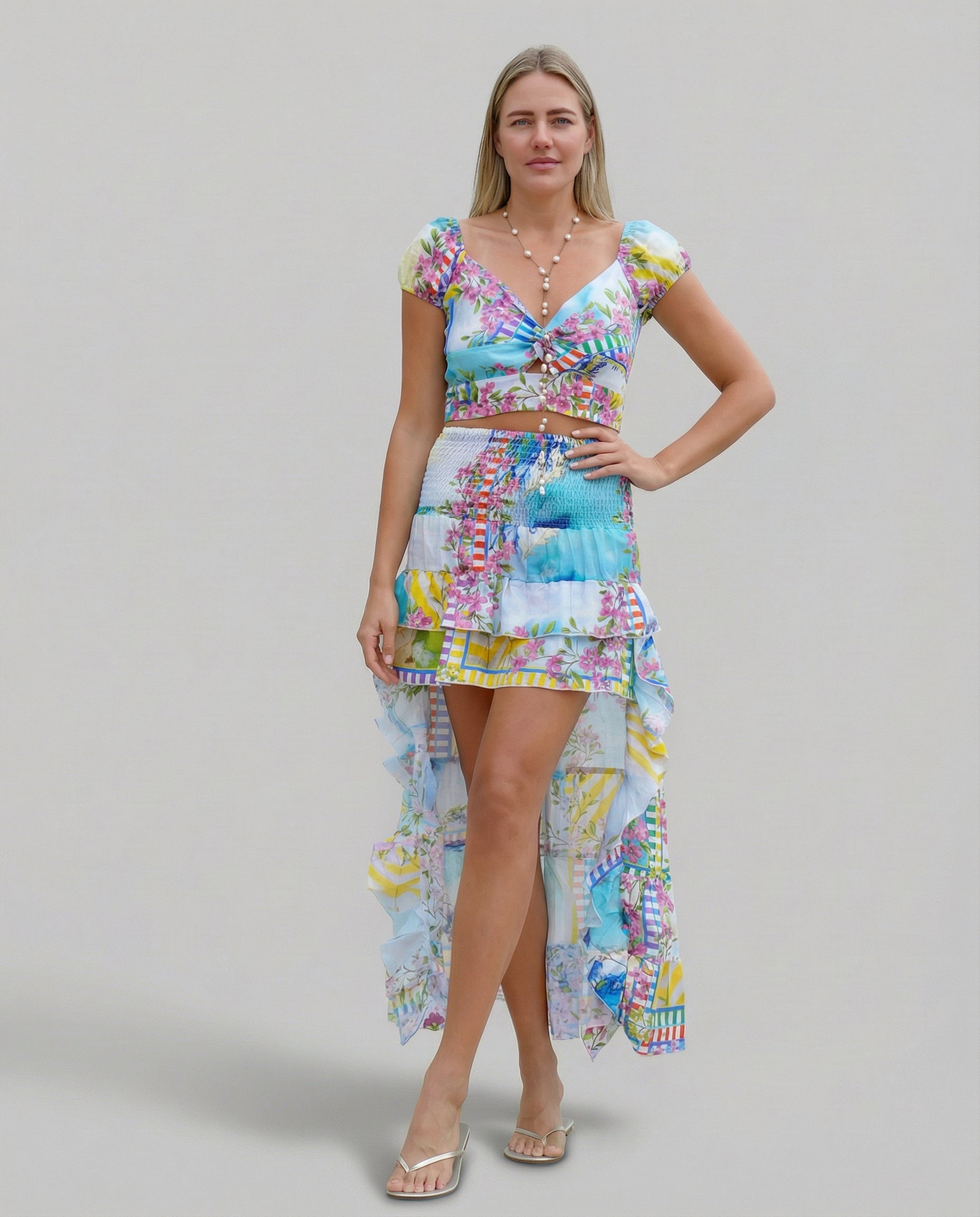 Our signature high-low max-length skirt showcases our favorite prints and colors and a ruffle trim at the hem.