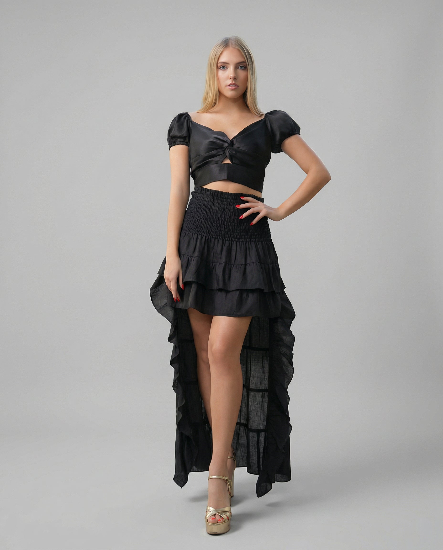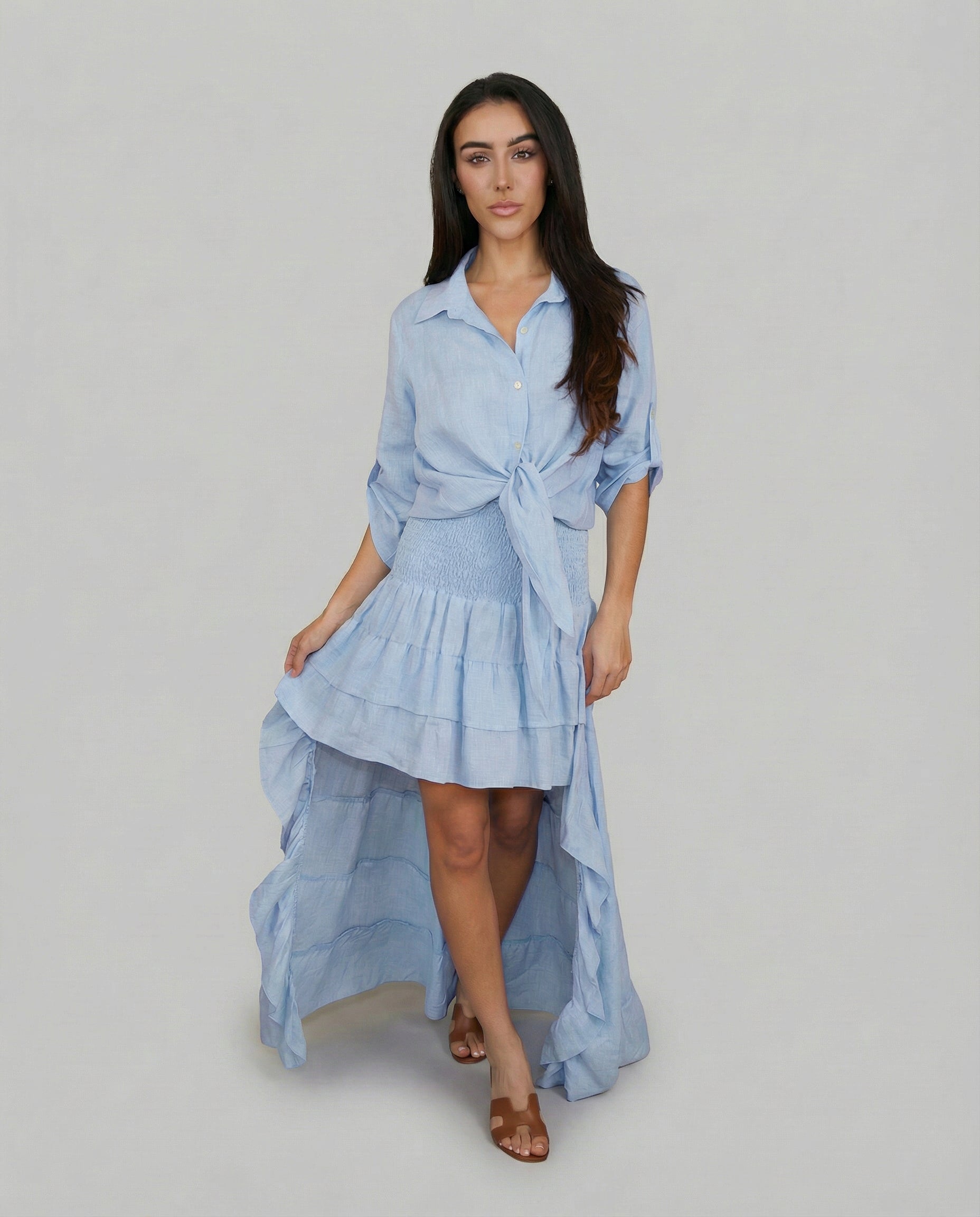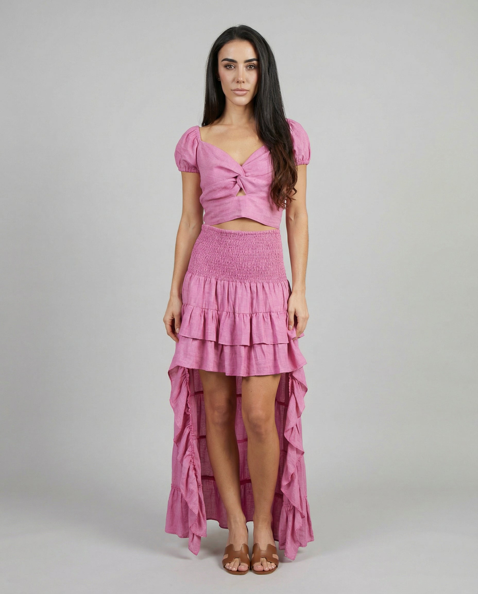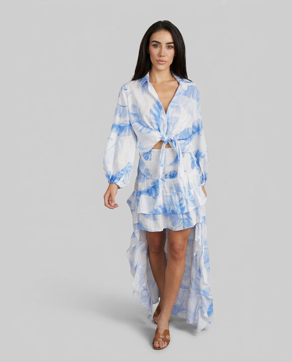 Our signature high-low max-length skirt showcases our favorite prints and colors and a ruffle trim at the hem.