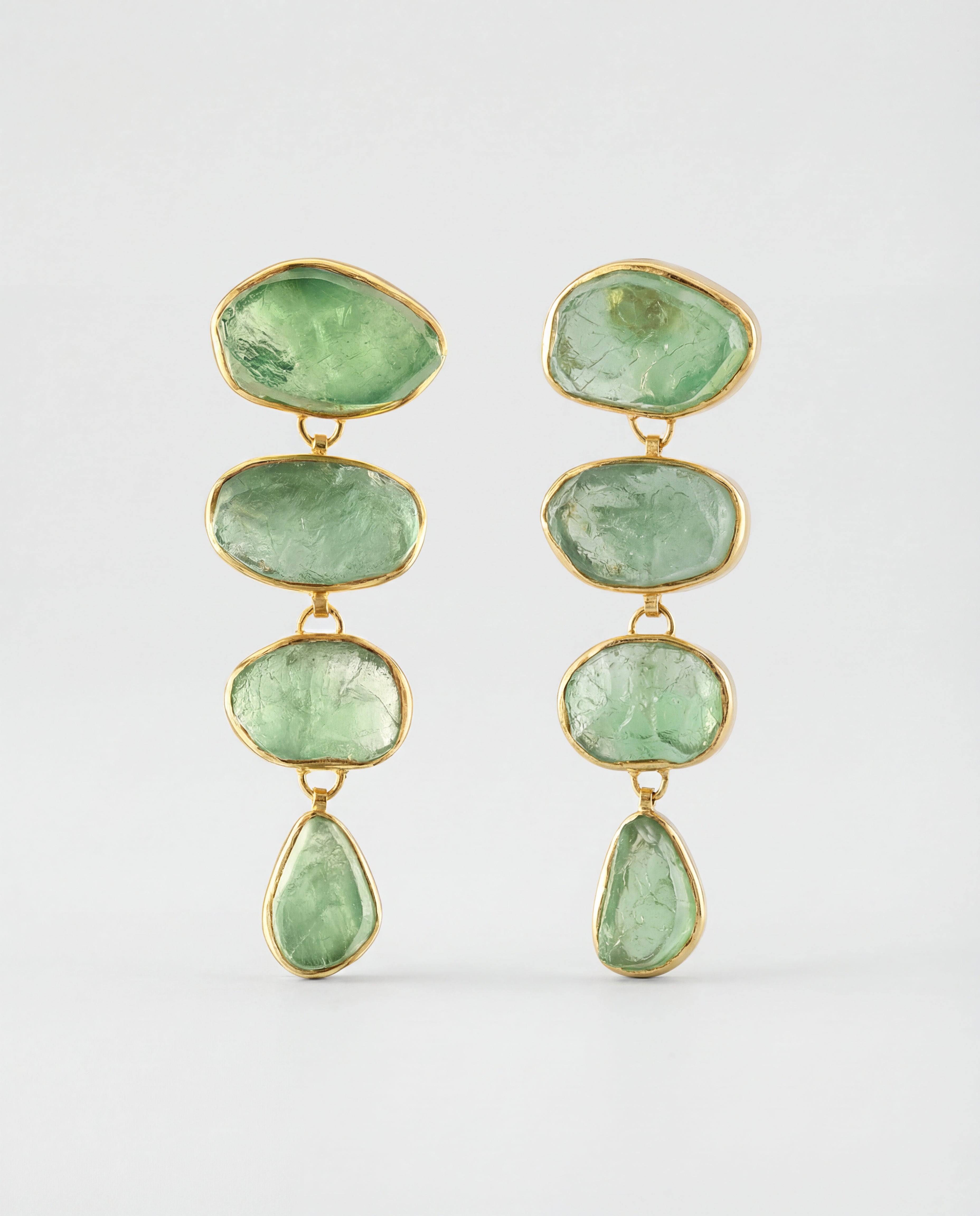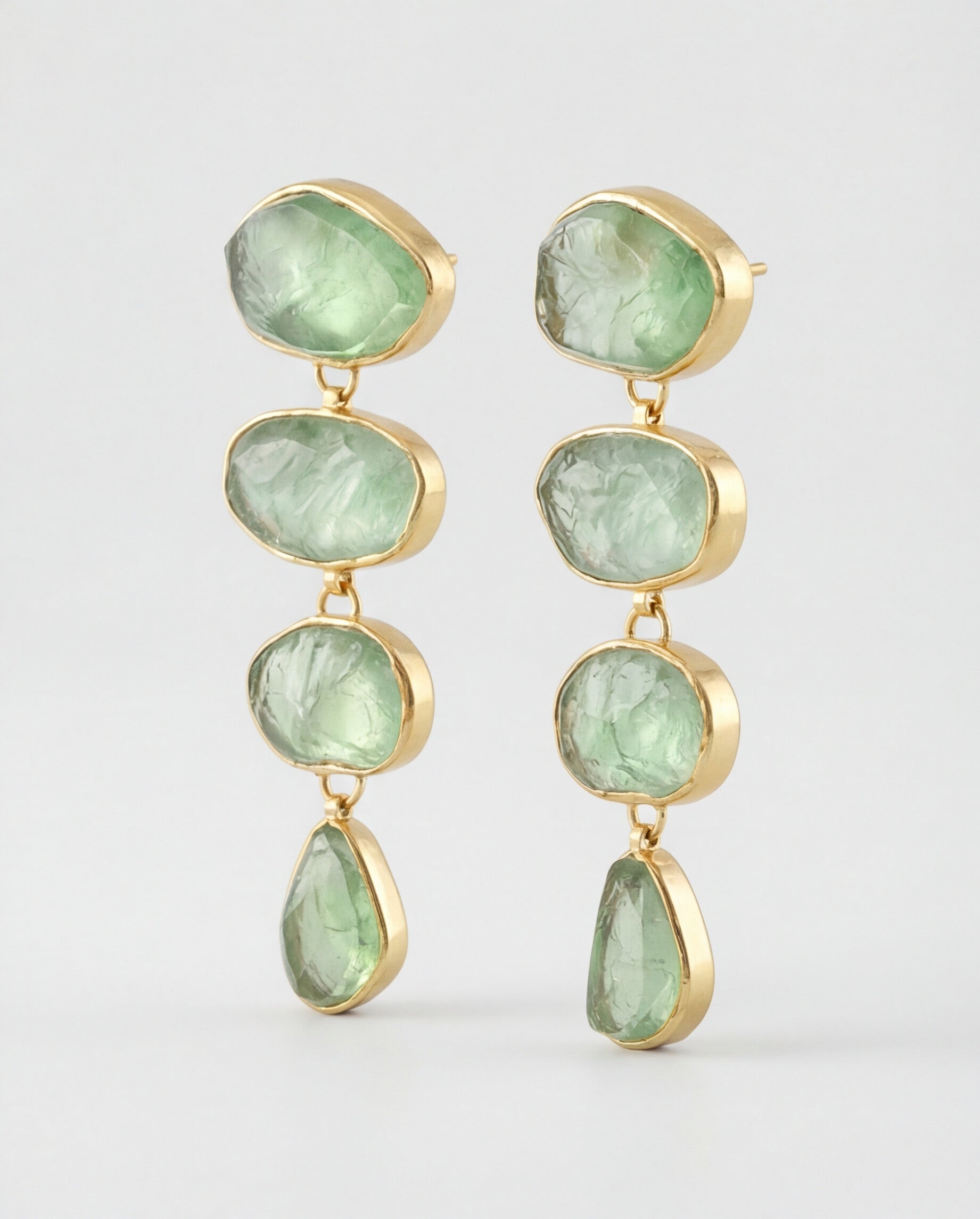 Bohemian goddess meets timeless glamor in our Green Fluorite Cascade Earrings, inspired by the beauty of nature. Raw stones are exquisitely handset over four tiers to capture light and movement, like sunshine dancing on emerald water.Ripe with the color of growth, Green Fluorite is your most powerful ally in the pursuit of new beginnings and unlocking doors of possibility.