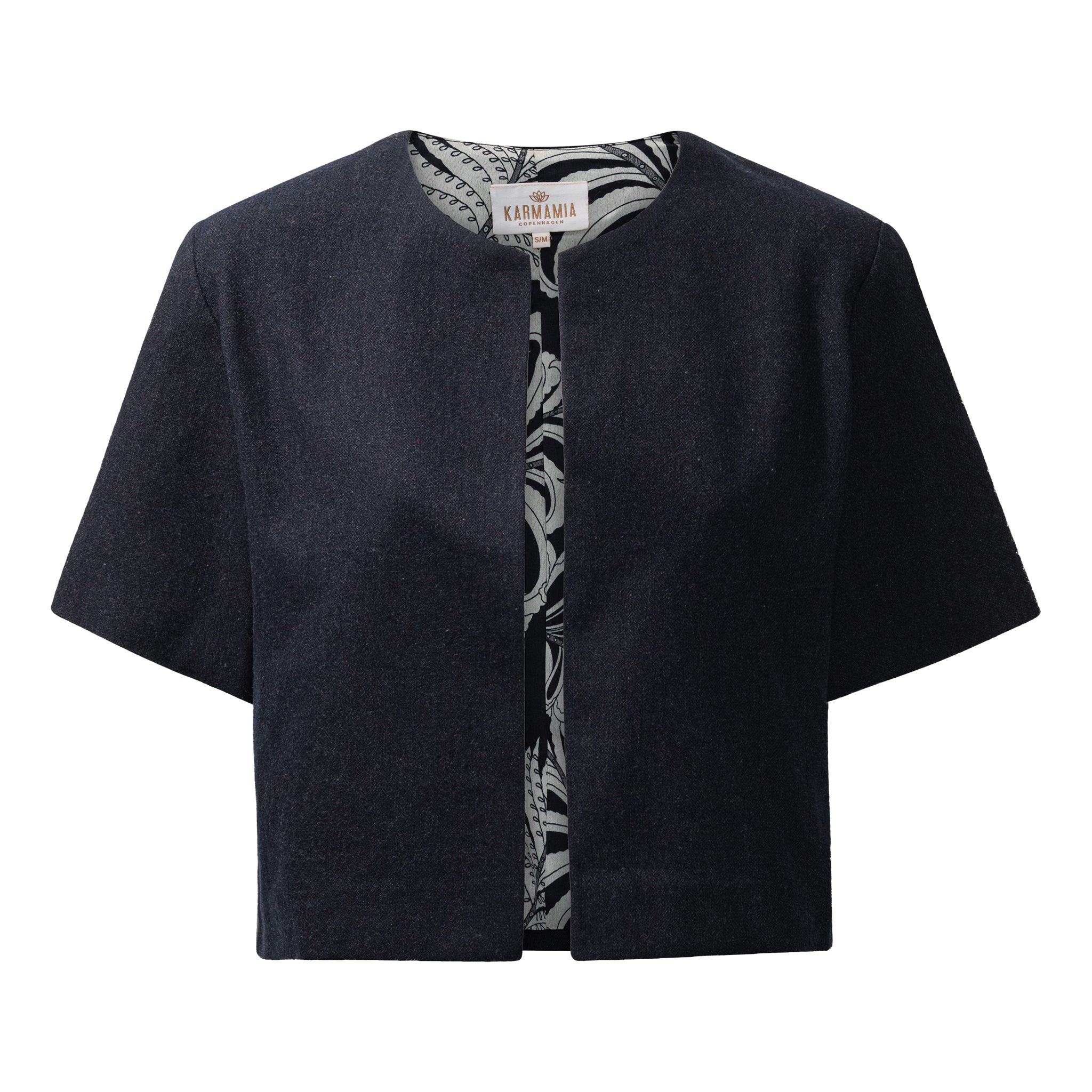 Cropped short sleeved jacket in a wool blend with satin lining. Perfect to wear with all sleeveless styles such as the Layla or Camisole Dress.