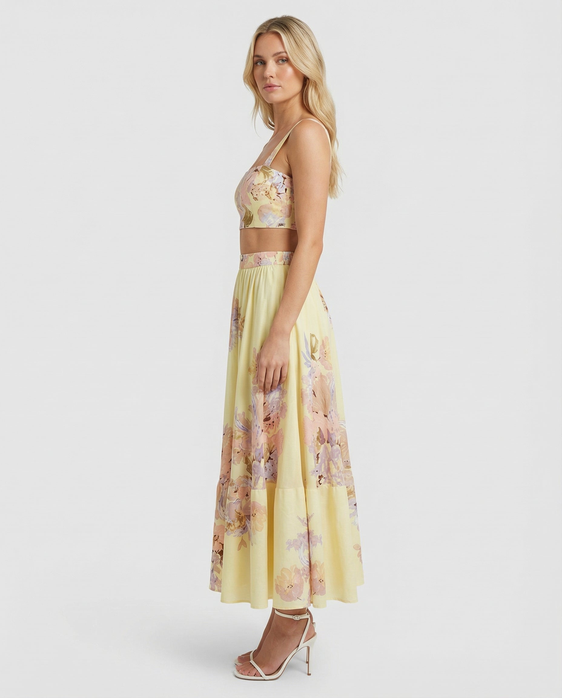Light and feminine, this cropped top is crafted in a delicate viscose organza linen blend with a soft pastel yellow base and romantic floral print. The structured square neckline and wide straps create a modern, flattering silhouette.