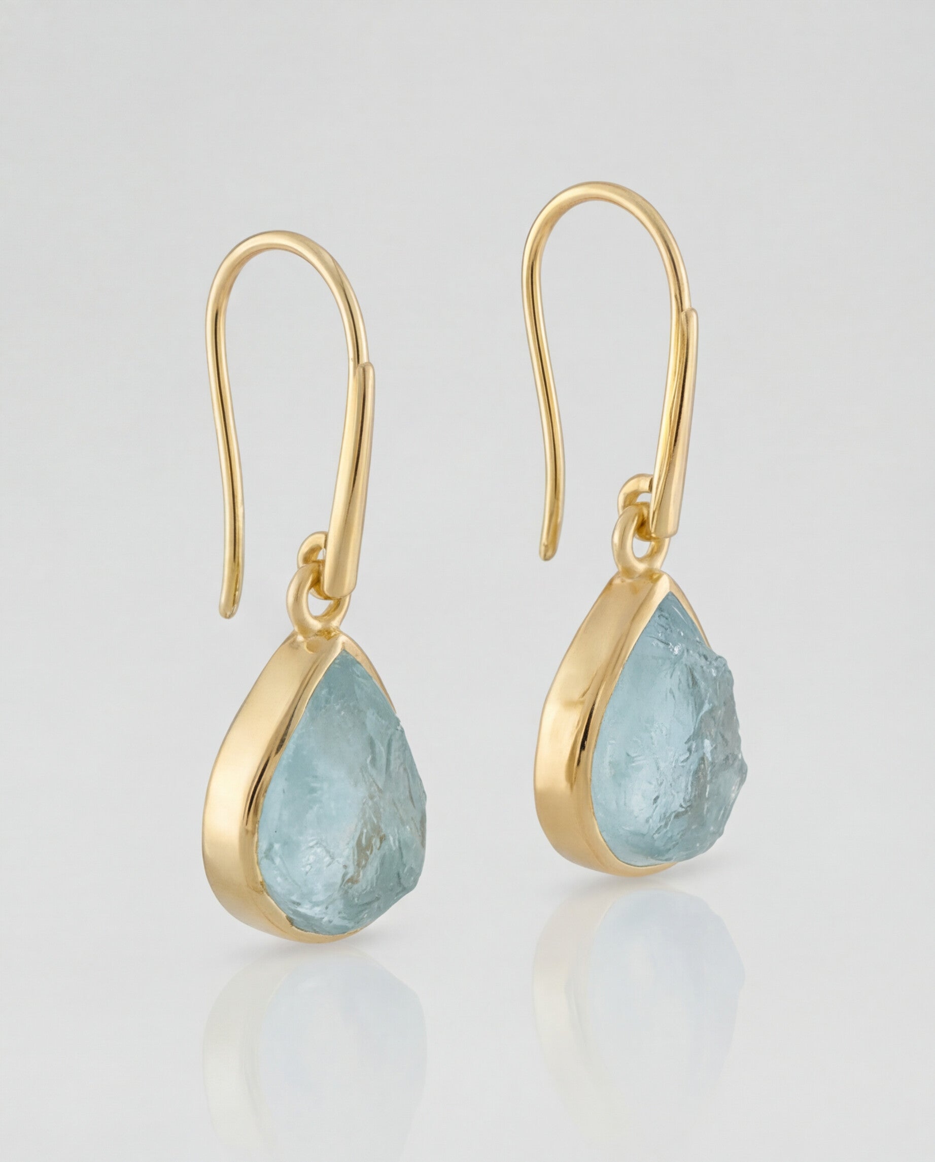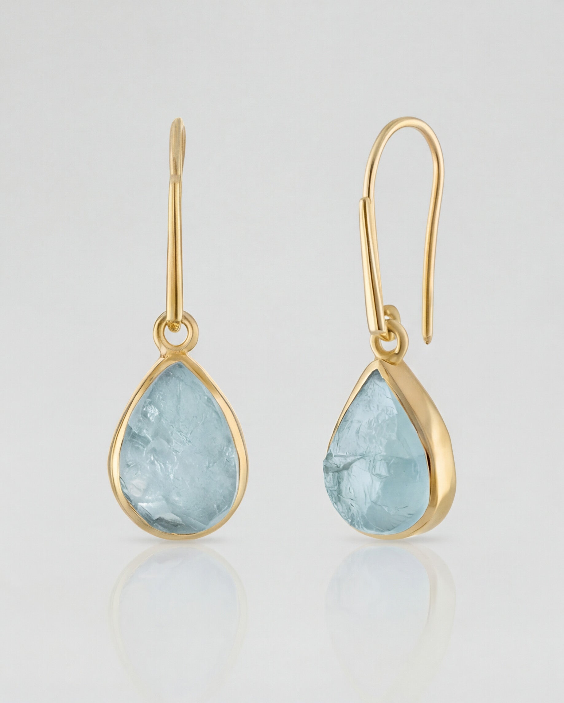 Dive into serenity in our Aquamarine Teardrop Earrings, conceived as natural accents of color and beauty that whisper tales of the ocean's mysteries. Like fragments of an underwater paradise, aquamarine 'droplets' float exquisitely beneath each lobe. Let the soothing waves of Aquamarine wash right over you with its beautiful blue hues... in the shape of water.