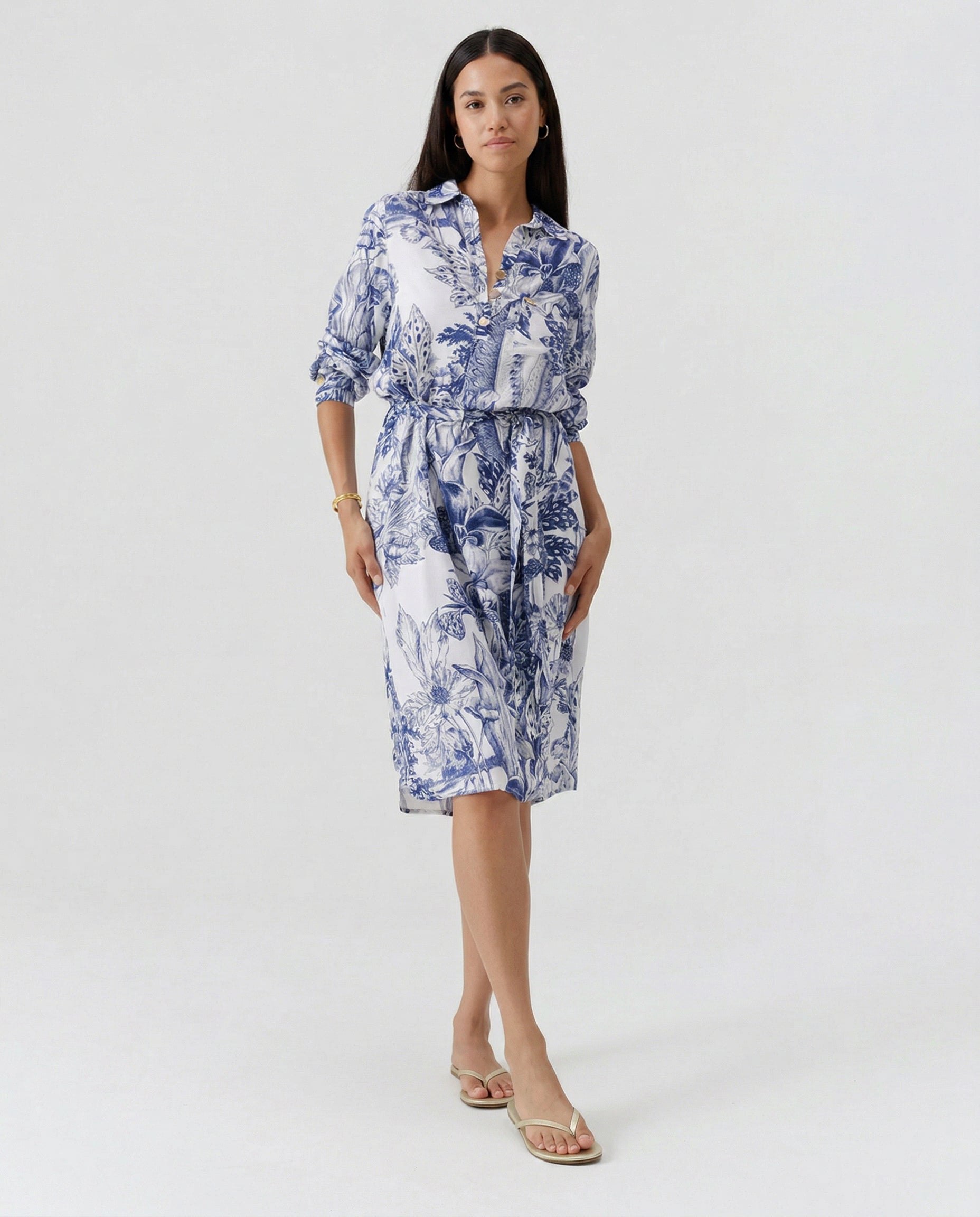 The Layla Dress in Paloma print is a timeless, holiday essential. Cut to a midi length, this belted shirt dress features a classic button-down front and long sleeves, creating a flattering, polished silhouette. The vibrant Paloma print adds a playful, contemporary touch to its refined design, making the Layla Dress perfect for effortless summer days or relaxed evenings in your favorite dinner spot.