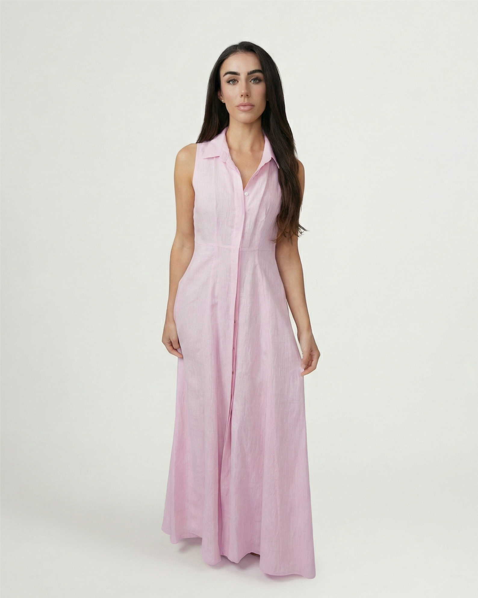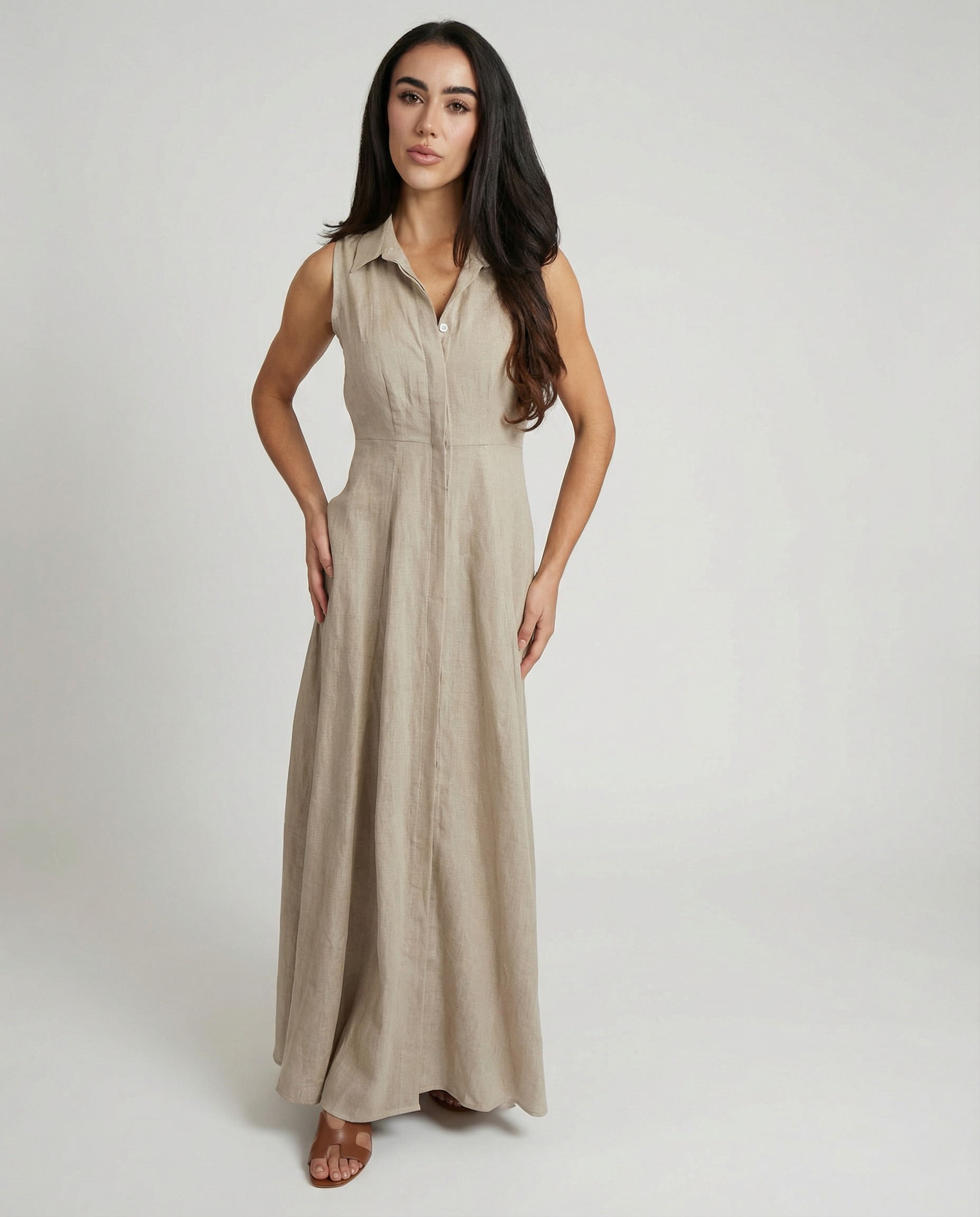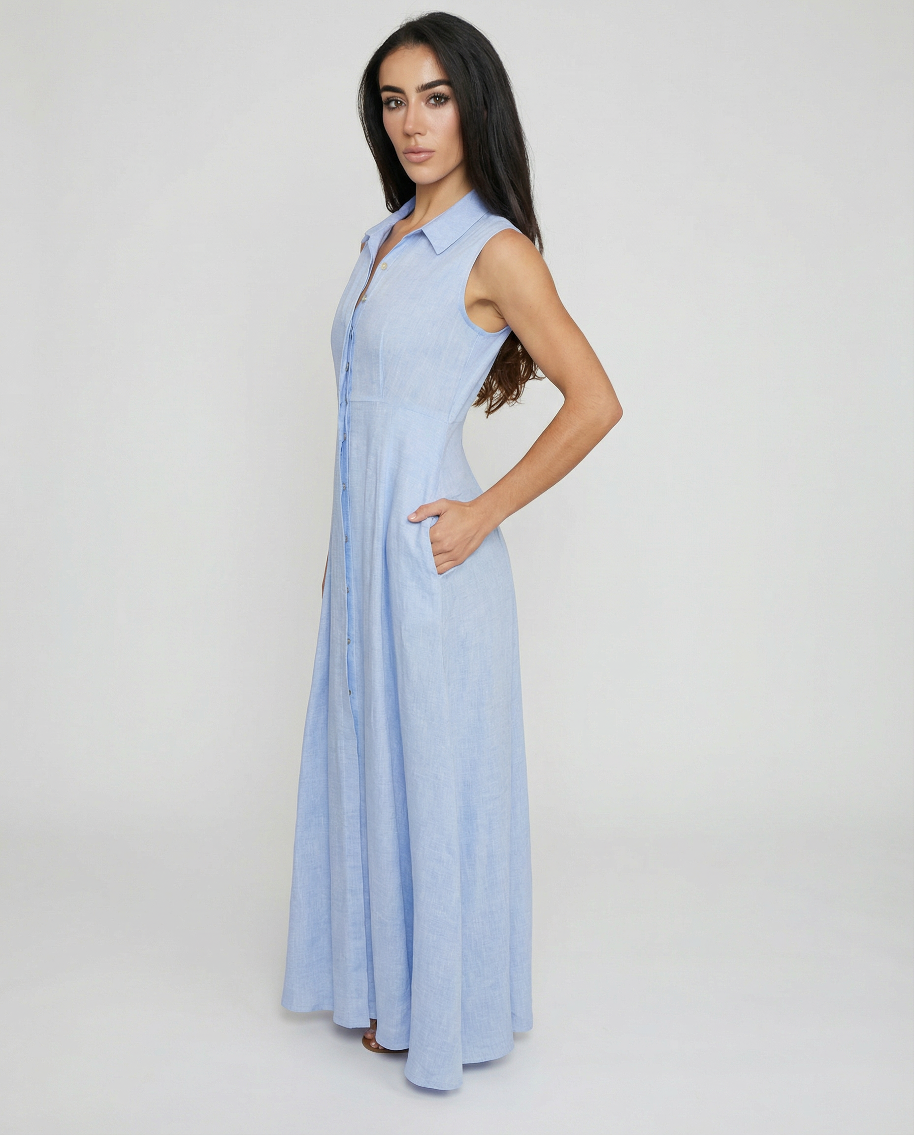 Effortless elegance meets timeless craftsmanship in this sleeveless linen shirt dress, tailored from 100% Italian linen. Front button closure and functional side pockets create a refined silhouette perfect for warm-weather dressing. Pair with our Linen Belt to complete the look—sold separately.