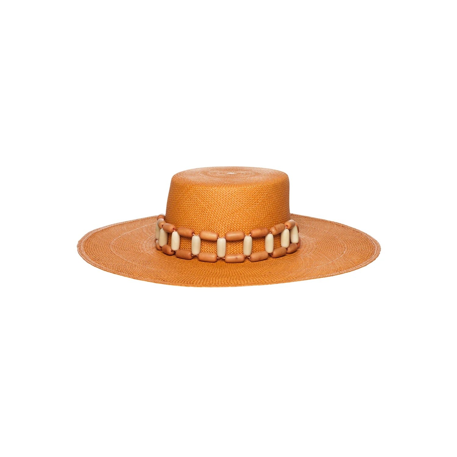 A band of thick, patterned tagua beads wraps the crown, adding rich texture and artisanal character to the clean silhouette. The Melides blends tradition and sophistication in equal measure—a sculptural statement piece designed for effortless elegance under the sun.