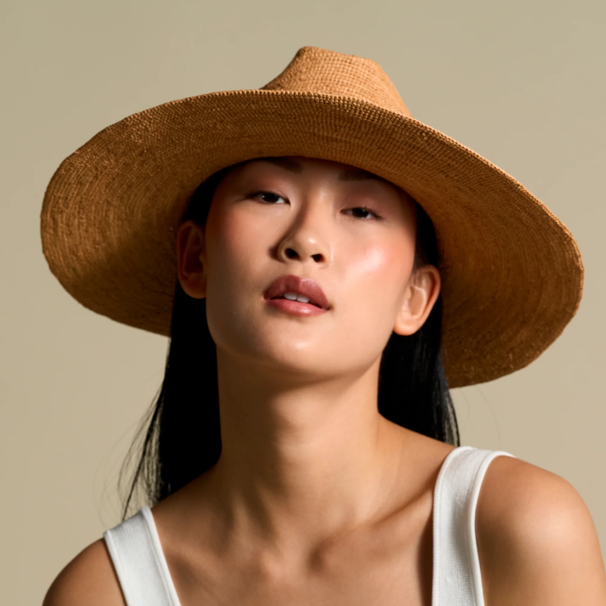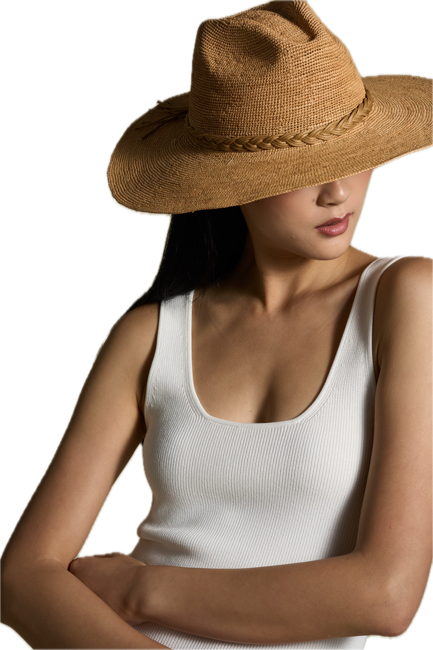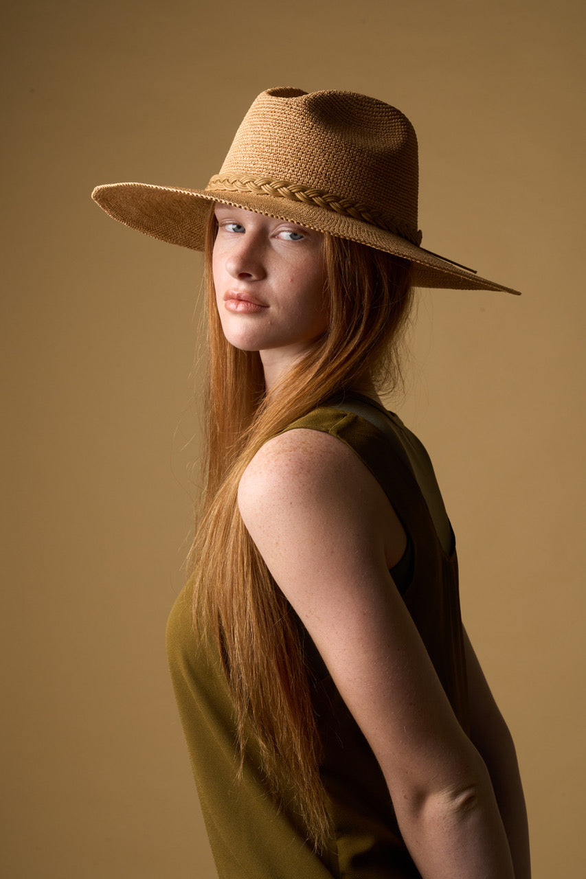 A woven braided cord in a matching dune hue adds subtle texture and refinement, blending seamlessly with the hat’s natural tone for a clean, monochromatic look. Timeless and understated, the Mira embodies the art of simplicity—crafted to elevate every moment under the sun.