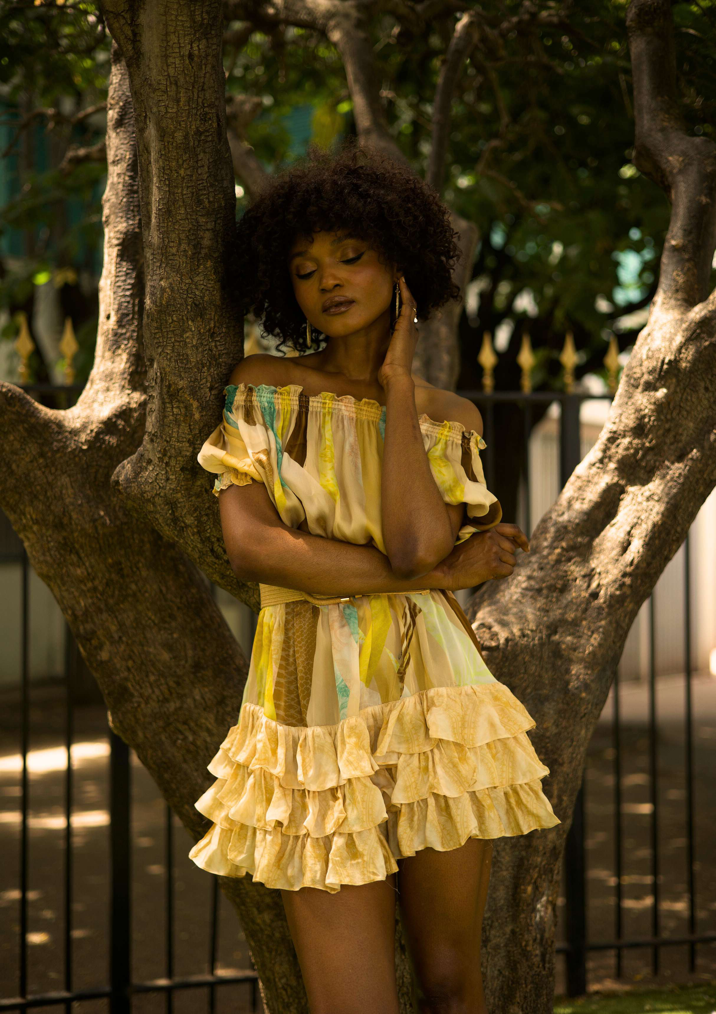 Off-shoulder neckline with elasticized short sleeves that create delicate ruffle details. The mini silhouette features a three-tiered layered skirt with voluminous ruffles for movement and dimension. Perfect for elevated casual occasions or evening events where you want to make a refined statement.