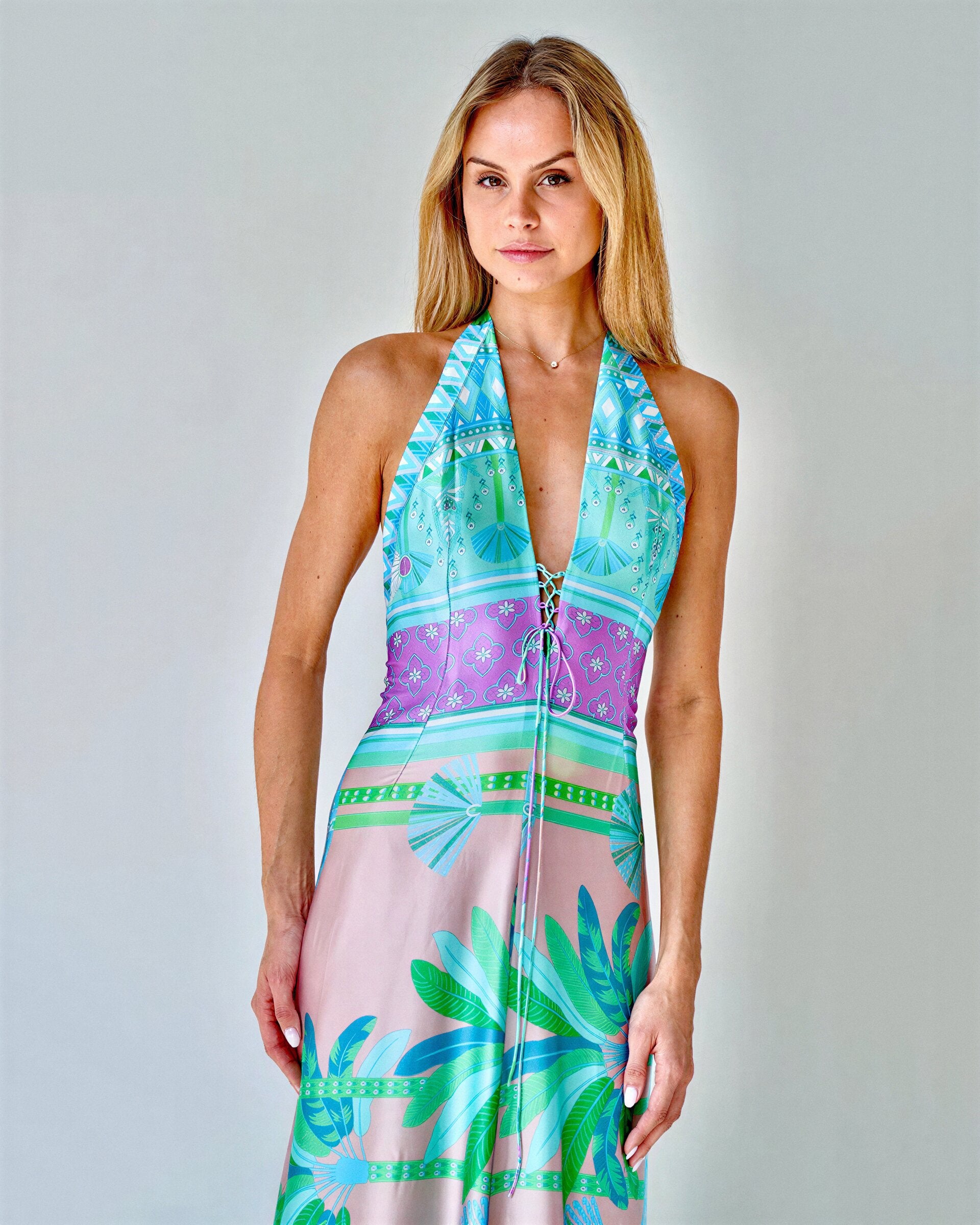 The design features a plunging neckline with delicate lace-up detail and an open back that ties at the neck — balancing allure and sophistication. Its fluid, floor-length skirt moves beautifully with each step, while the vivid turquoise, lilac, and sea-foam green palette evokes the shimmer of sunlit water.