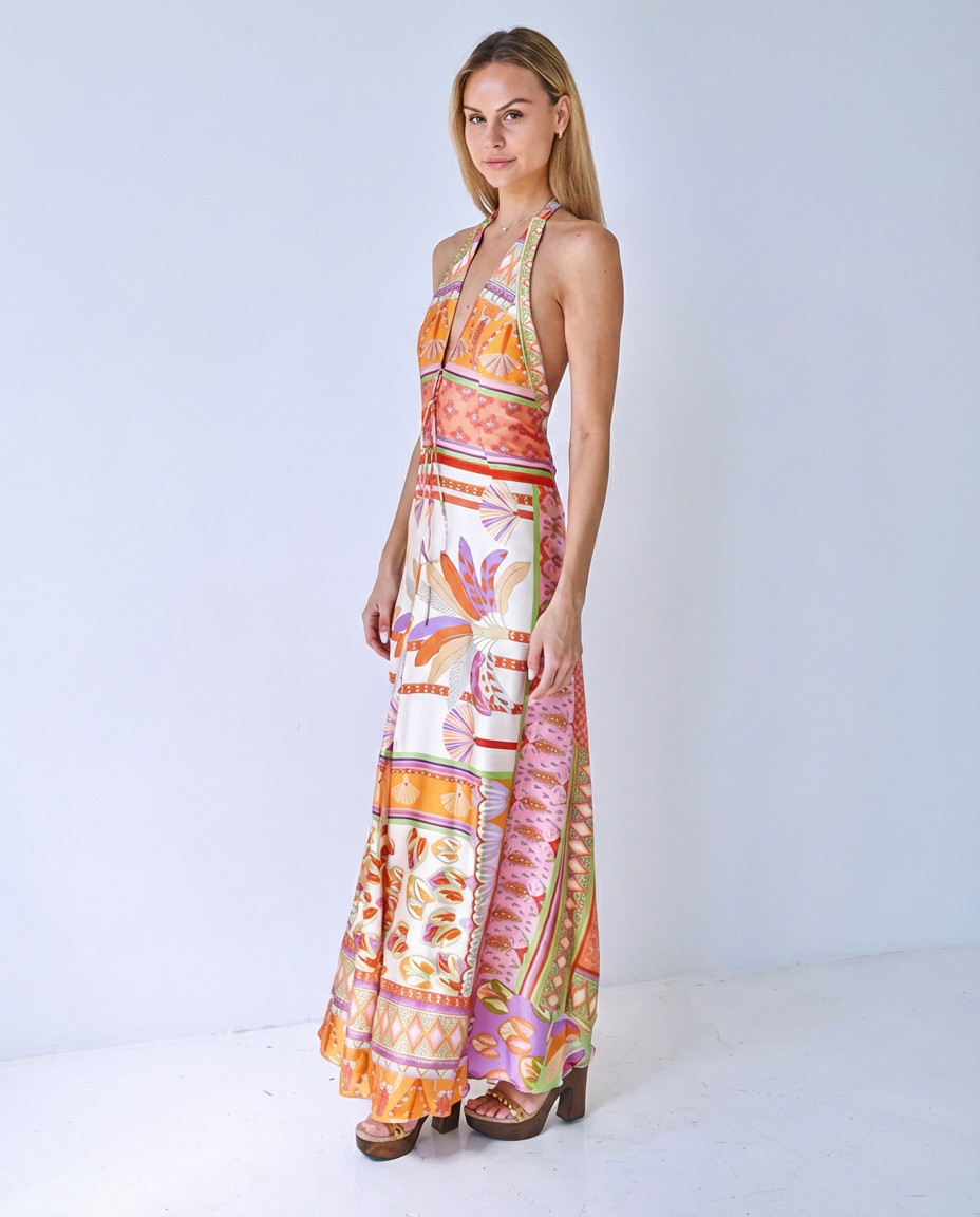 Poolside Gossip 202C is an effortlessly glamorous halter-neck maxi dress designed to turn heads from golden hour to long summer nights. Cut in fluid, lightweight silk, it skims the body with a flattering, elongated line while remaining easy and wearable.