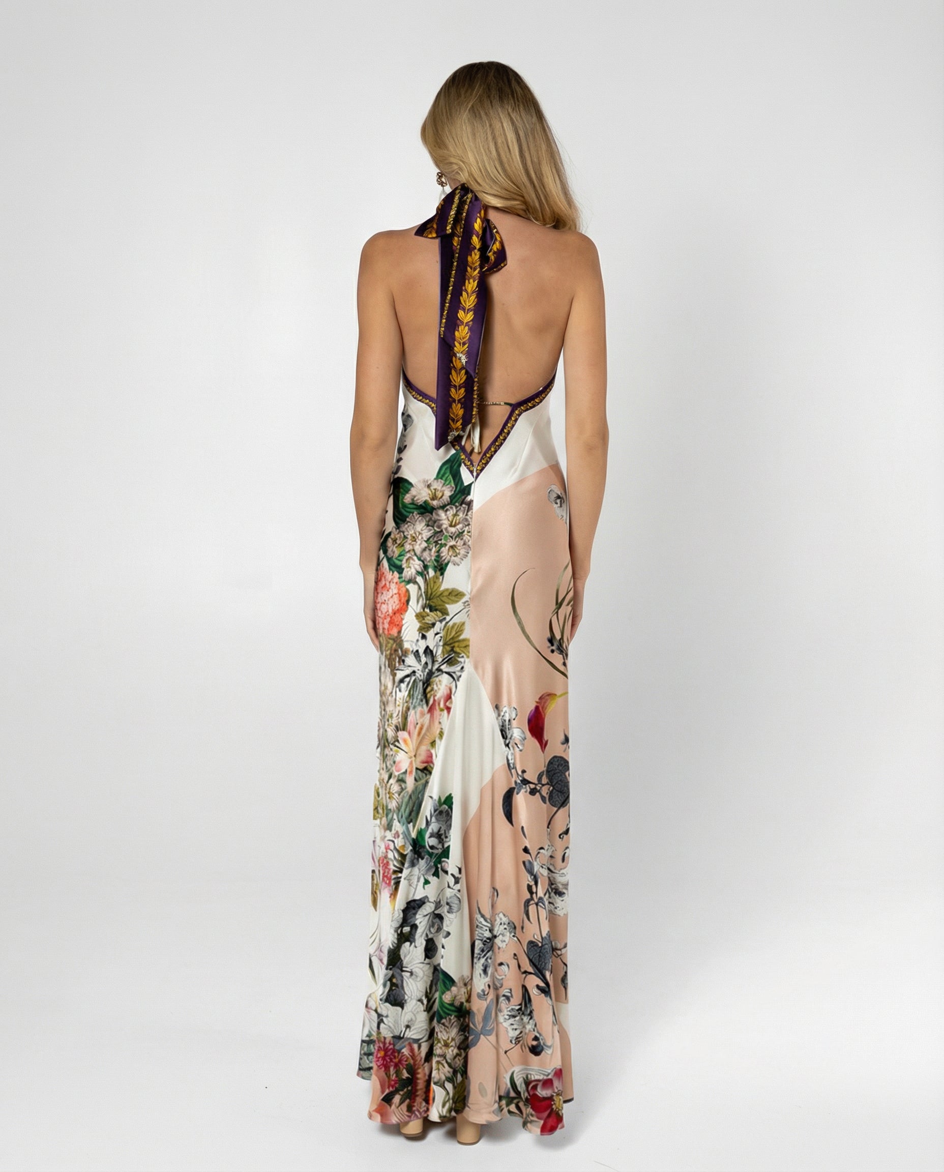The Rosa Linda dress is a celebration of femininity and individuality, designed to empower the modern woman with its enchanting silhouette and exquisite details. Featuring a chic tie at the neck and a discreet zipper closure at the back.