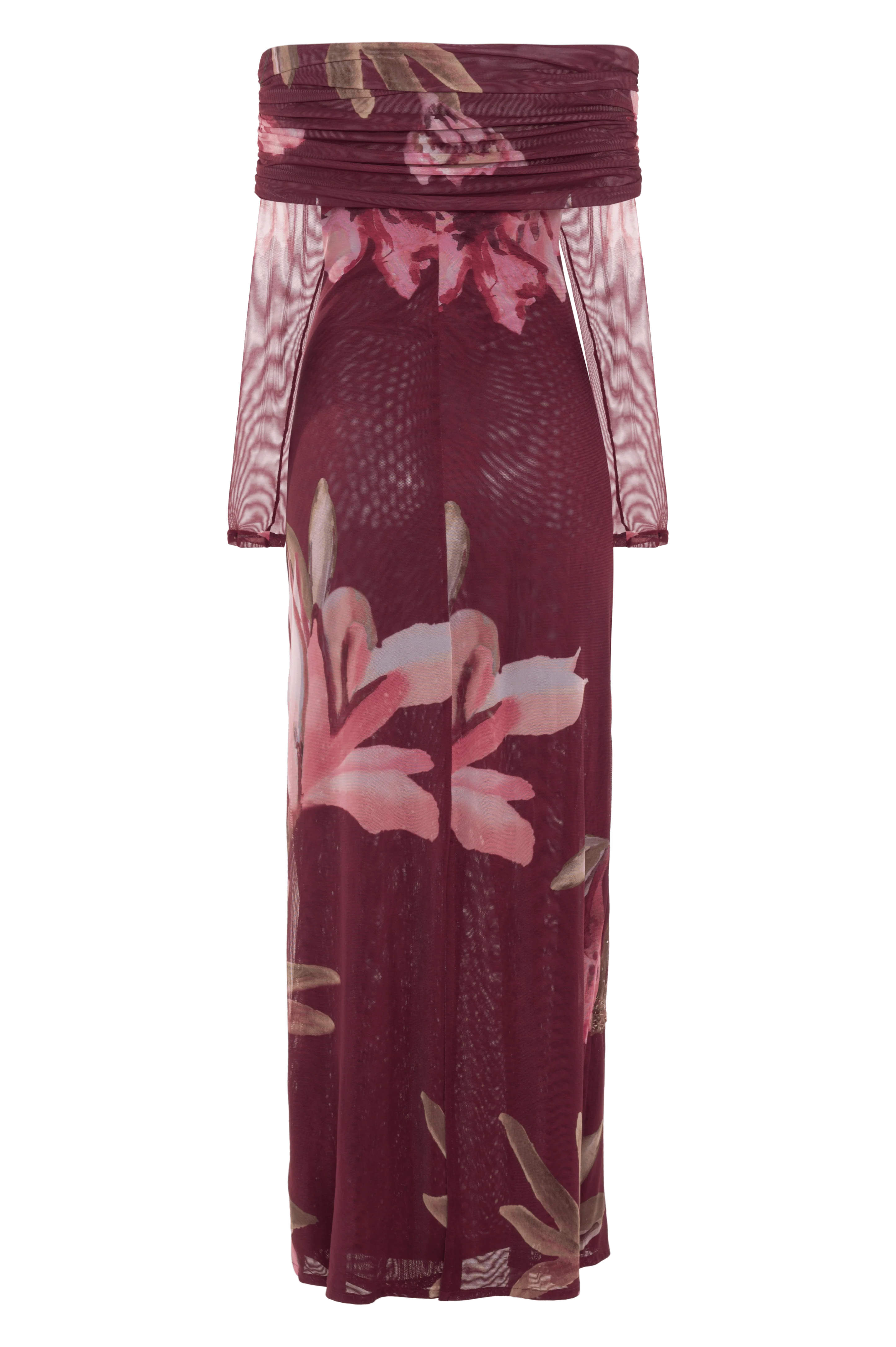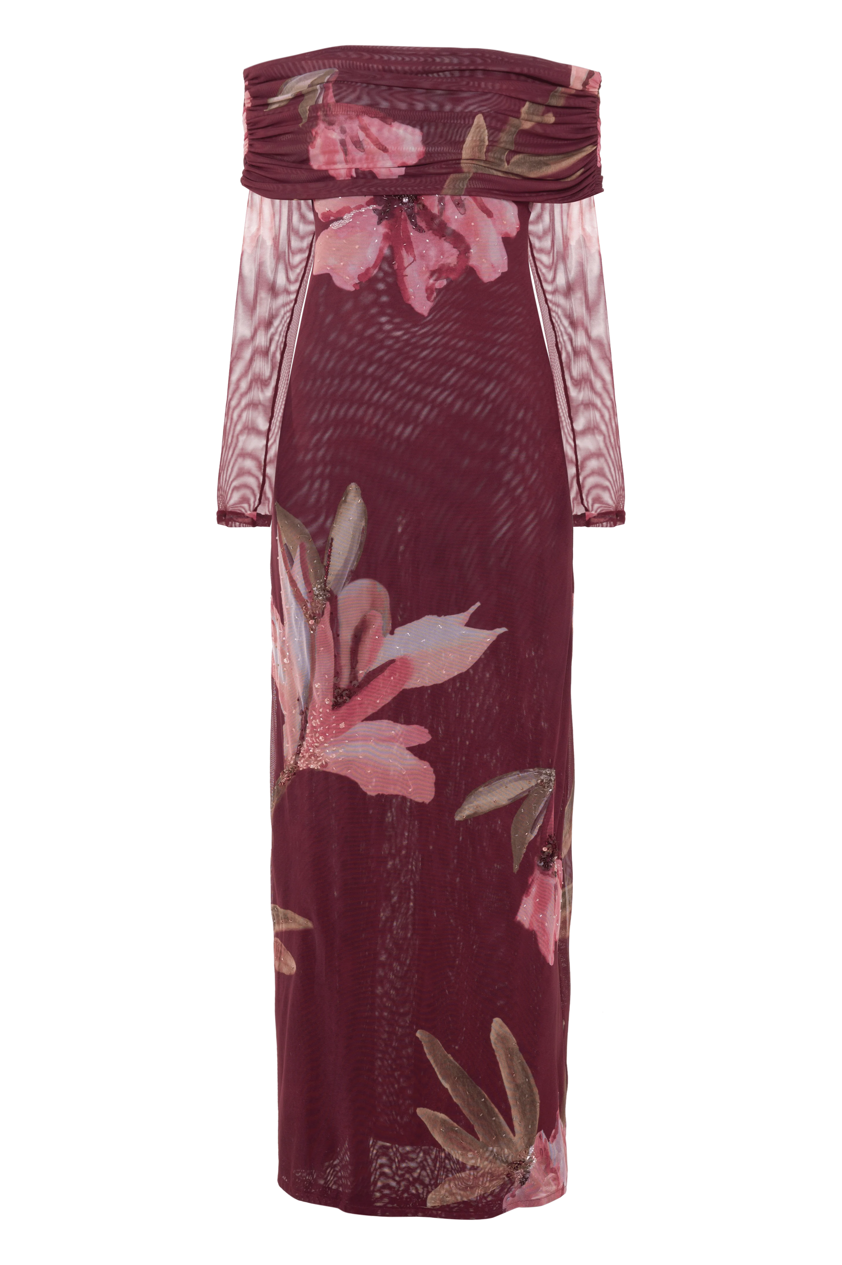 The Delicata Tulle Maxi Dress is an off-the-shoulder beauty featuring the Delicata motif. Dramatic yet effortlessly chic, this piece hugs the body in all the right places, creating a stunning silhouette. The back slit adds a touch of allure, making it perfect for both everyday elegance and special moments.