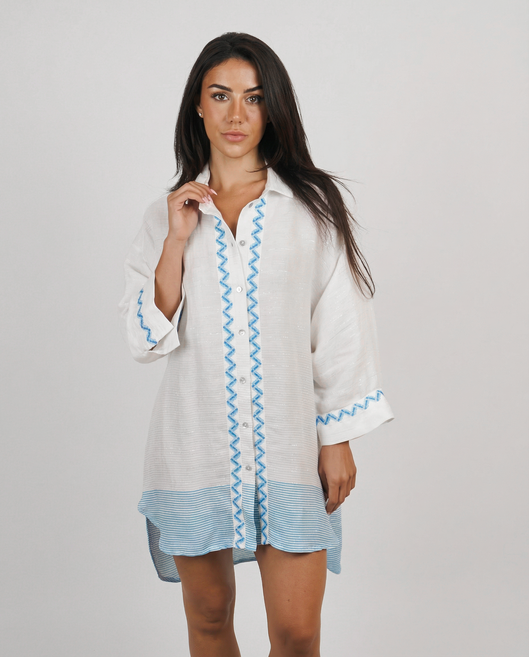Oversized shirt featuring expertly crafted embroidered details across the front, sleeves, and hem. This relaxed-fit silhouette delivers effortless sophistication, seamlessly transitioning from casual to refined styling. The artisanal embroidery adds distinctive texture and visual interest, elevating the piece beyond basic essentials. Versatile enough for layering or wearing solo, it's a wardrobe staple that works across seasons and occasions.