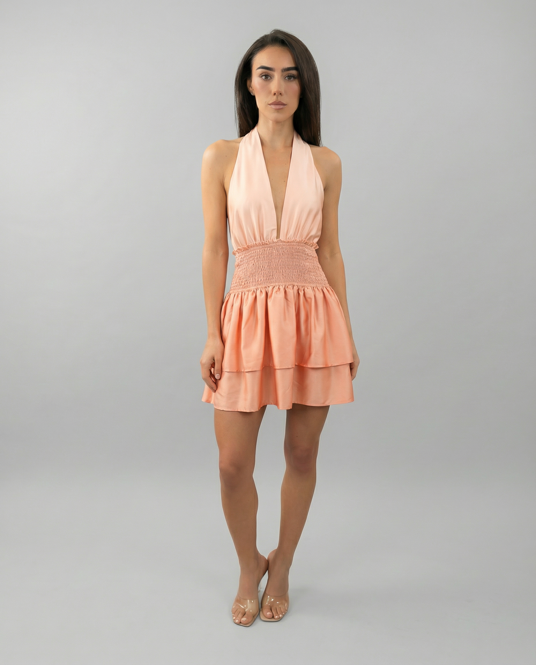 A sophisticated halter-neck mini dress that channels timeless glamour with a modern twist. The elasticized waist creates a flattering silhouette while ensuring all-day comfort. Features a striking degradé pattern that adds visual depth and movement to the fabric. The halter neckline elongates the shoulders and frames the décolletage beautifully, making this piece ideal for cocktail events or elevated evening occasions.