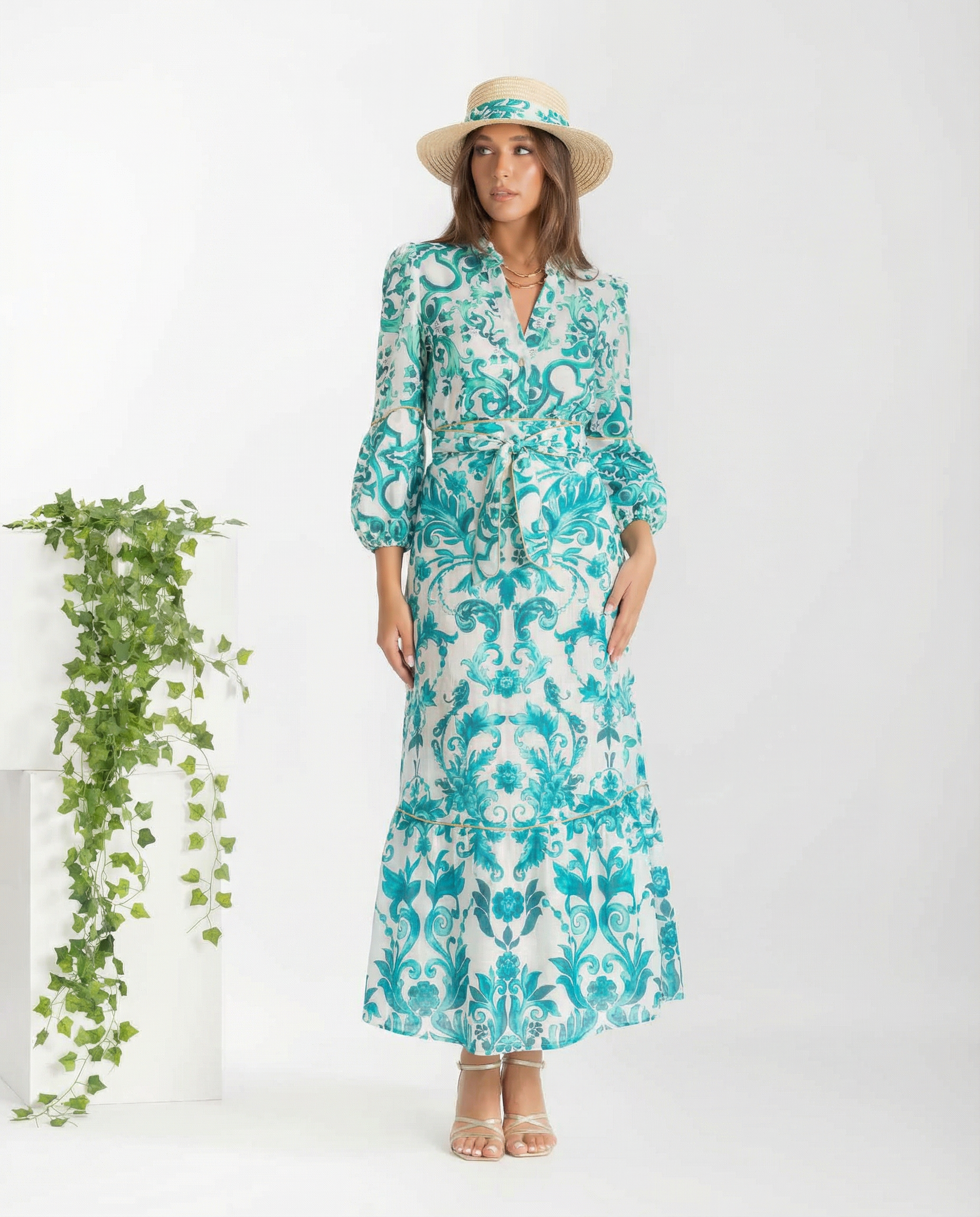 Positano Monaco Long Dress combines timeless elegance with contemporary design. This sophisticated shirtdress features a structured Mao collar and a coordinating belt that defines the silhouette. Long, voluminous puffed sleeves add movement and dimension, while a graceful ruffle hem creates a refined finish. Perfect for elevated occasions or refined everyday wear, this piece transitions seamlessly from day to evening with its polished construction and flattering proportions.