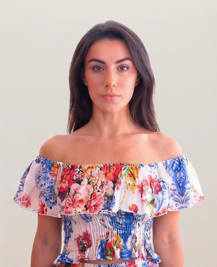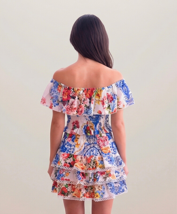 Off shoulder ruffle top in our beautiful print match perfectly with our Hedy, Daisy and mini skirt