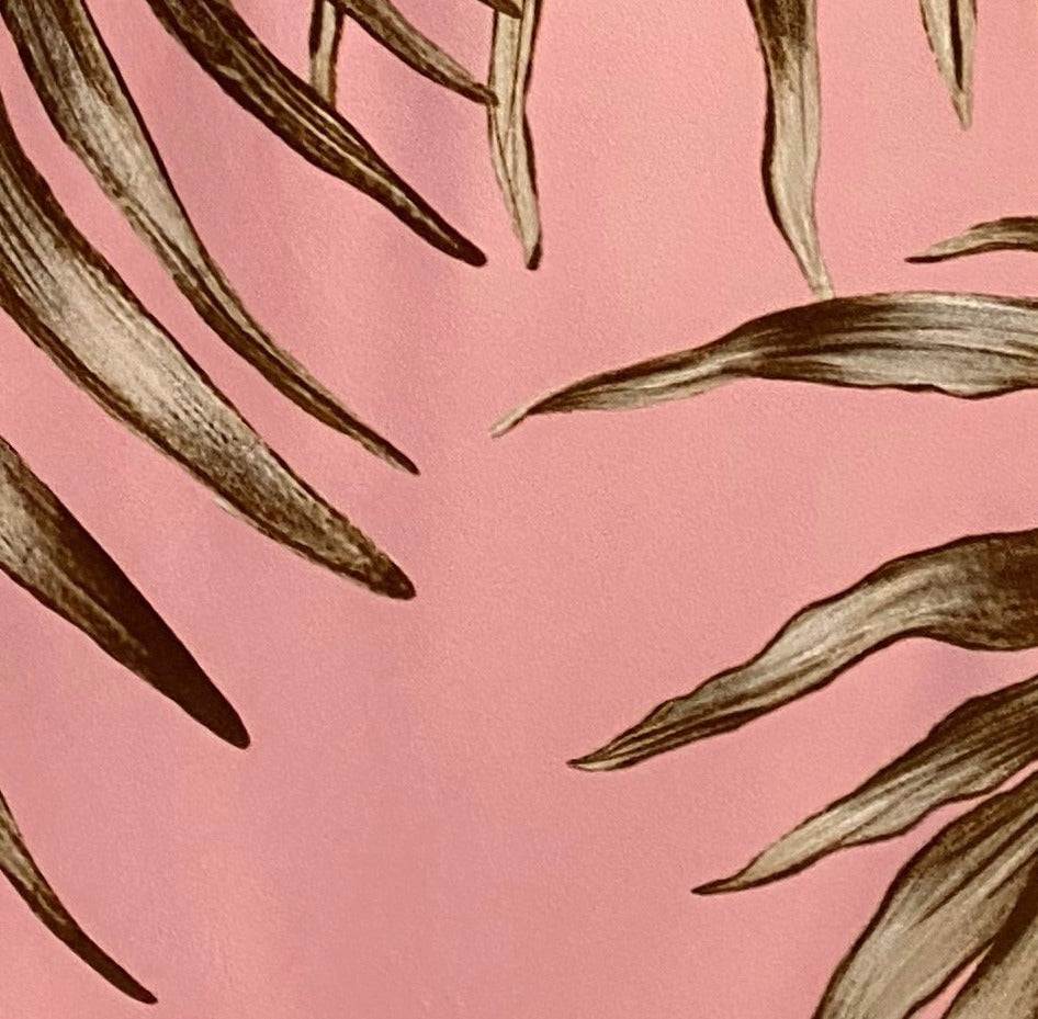 A tropical-chic statement piece in luminous double satin. This fawn pink top features a soft scarf cowl neckline, delicate spaghetti straps, and an elegant palm-inspired print in warm earthy tones. Flattering and fluid, perfect styled with the matching skirt or crisp white linen for an effortless resort look.