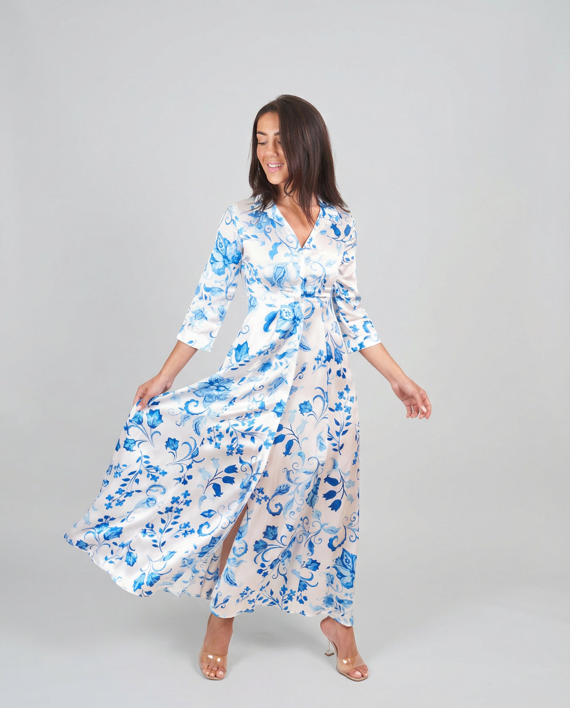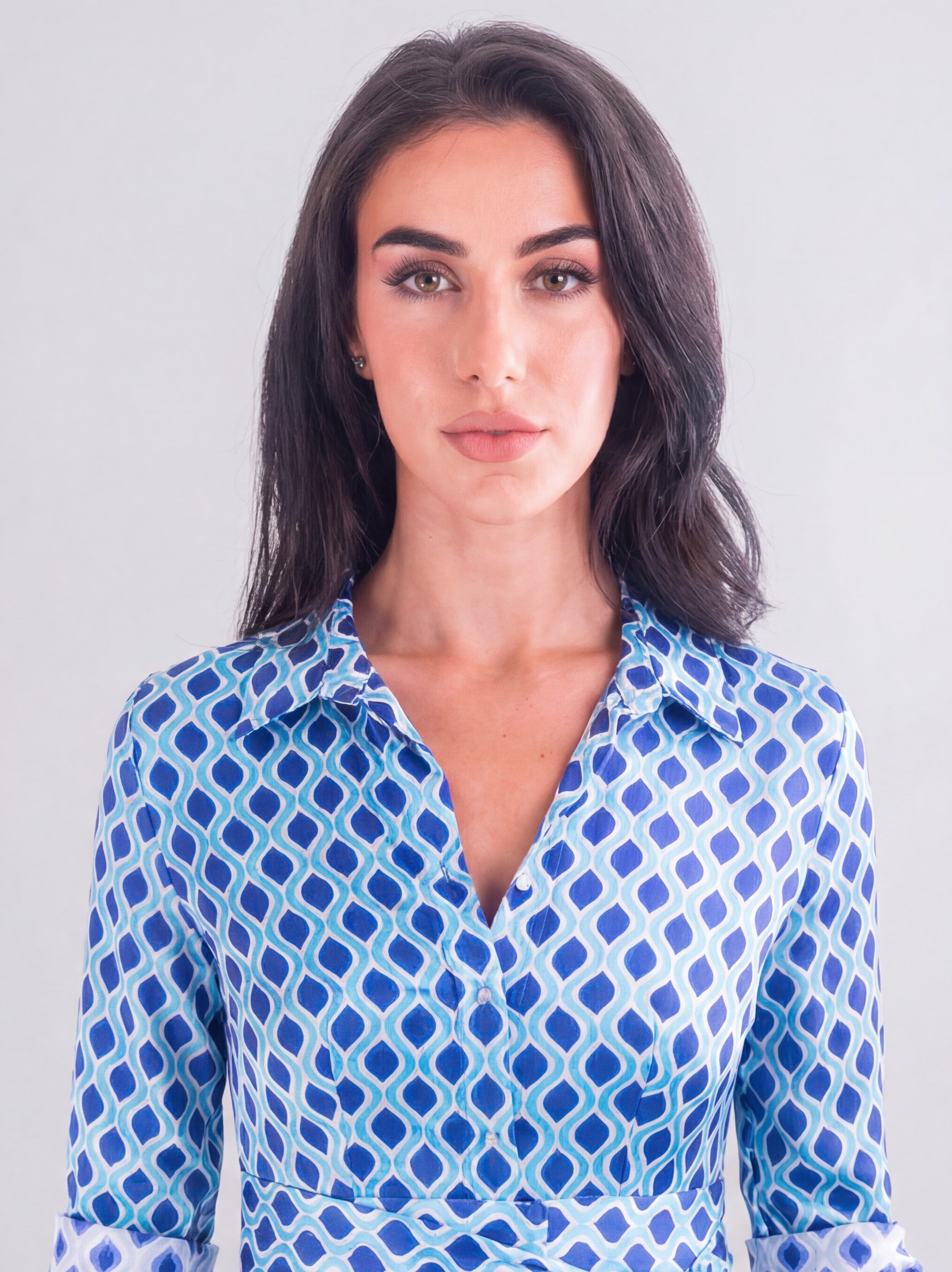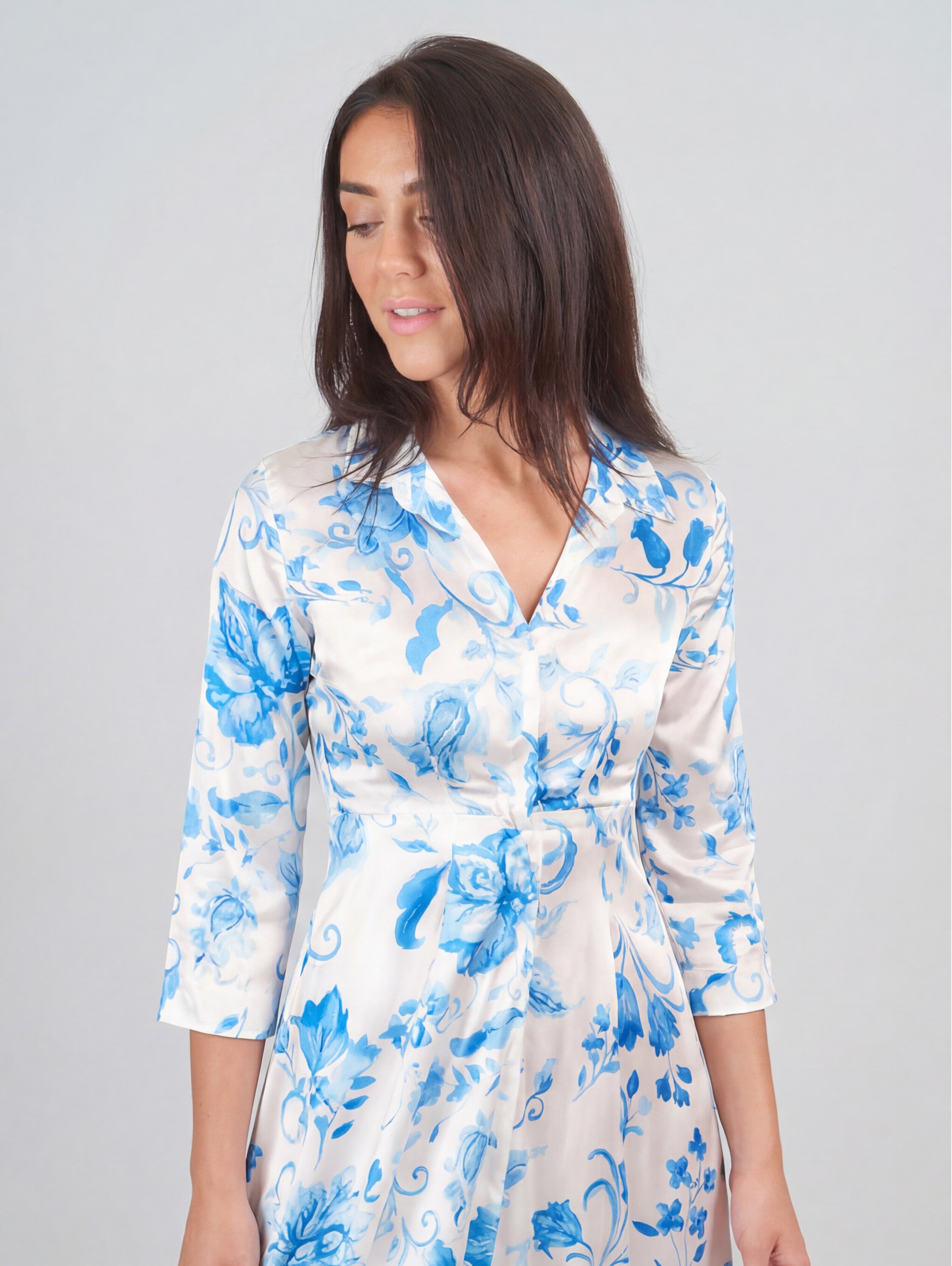 Our Spolverino silk dress features unique prints and colors. Perfectly combining our favorite style elements like the classic silhouette crafted in 100% silk and the traditional point collar with the roll-up sleeves. Is fitted in the waist for some extra definition. Add the matching belt for the complete look.
