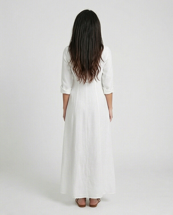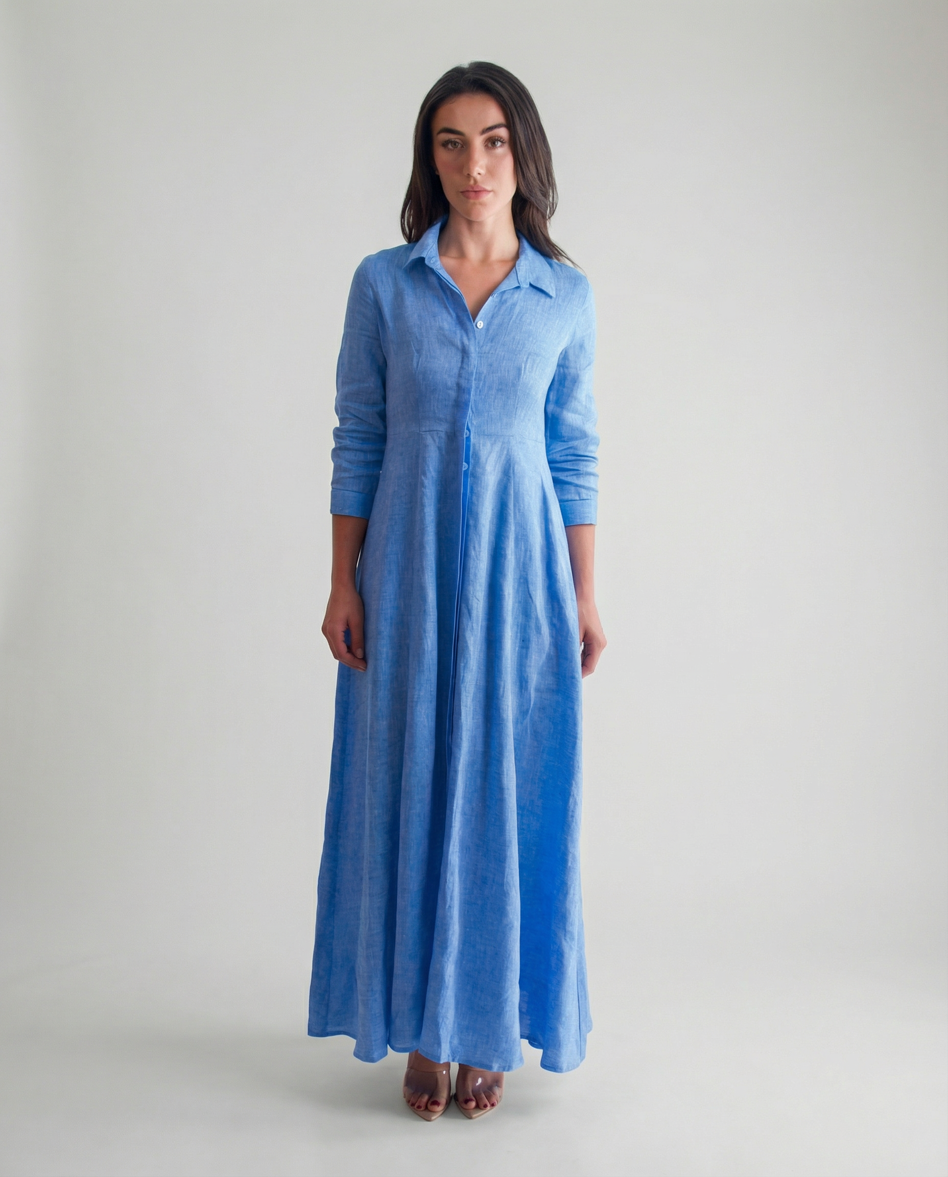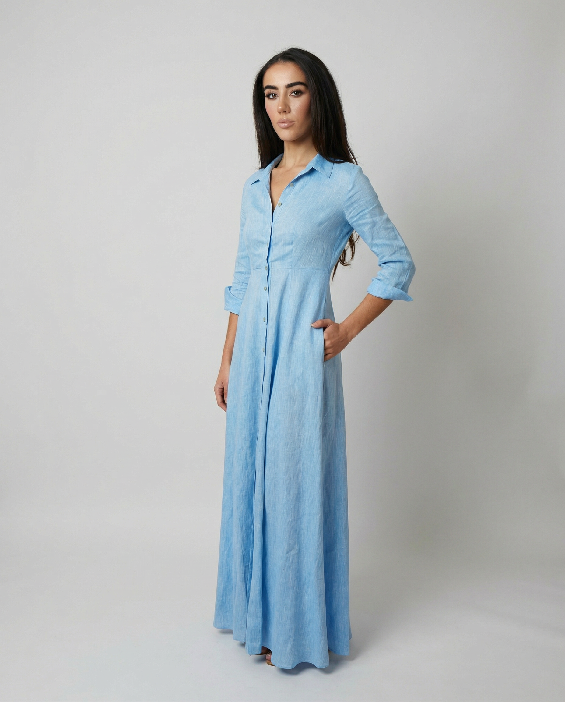 Our shirt dress has everything you ever wanted in a full- length, button-up dress. A long, lean, and lovely silhouette that will elongate your torso. Enjoy the versatility of this dress by wearing it as a dress or open as a duster. Wear it casually by rolling up the sleeves or dress it up with one of our leather rope belts for a perfect resort chic look.