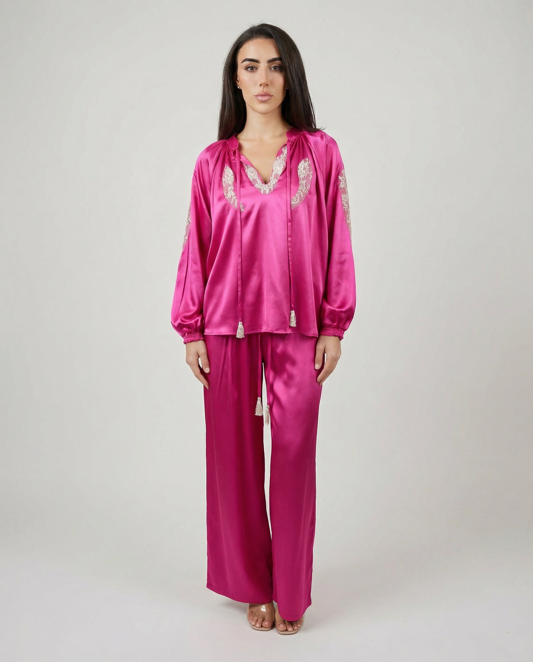 • V-neckline with tassel ties, long gathered sleeves, and a straight relaxed fit
