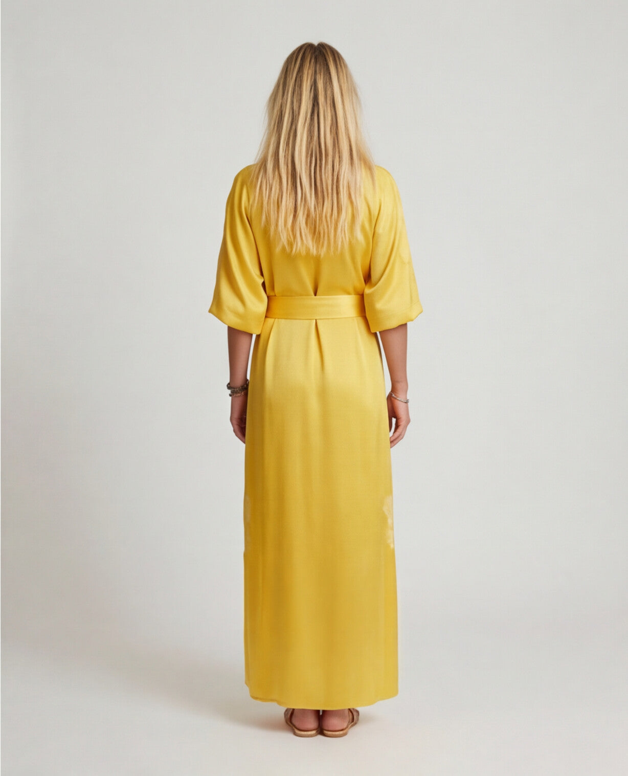 The Pascale Kaftan in Satin Silk embodies timeless sophistication with a fluid, luminous drape. Designed with a deep V-neckline adorned with delicate Calais lace, it features long, elegant sleeves and a wide tie belt that accentuates the waist. The side slits add graceful movement, making this piece perfect for both refined evenings and relaxed summer moments.