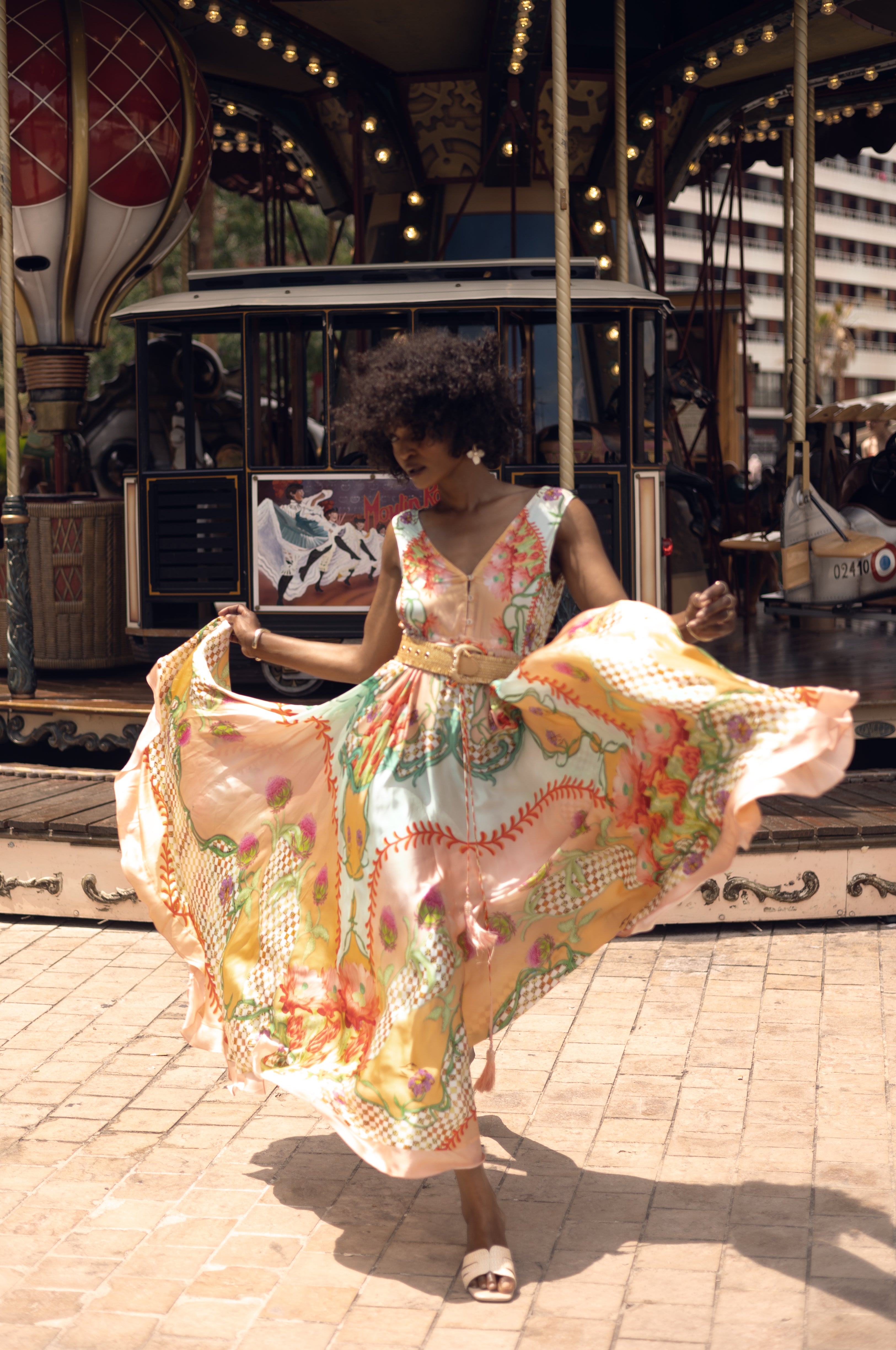 Viola Maxi Dress in luxurious cherry satin, featuring a flattering V-neckline and fitted waist defined by a sleek belt. The semi-open back and horizontal halter strap create an effortlessly sophisticated silhouette, perfect for evening occasions and special moments. A timeless piece that balances elegance with modern design.