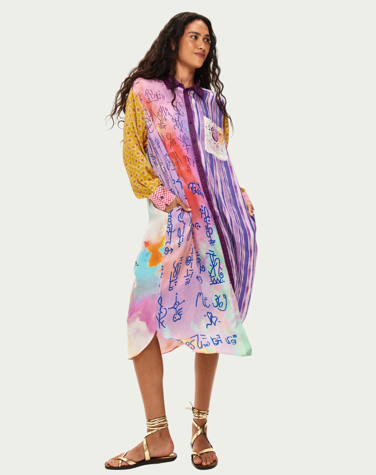 Embrace your spiritual journey in the Vivi shirt dress, a bold statement piece celebrating "LESS EGO, MORE SOUL." This striking midi dress features contrasting purple and white vertical stripes on one side, while the other showcases mystical runic scripts and yoga symbols in vibrant sunset hues.